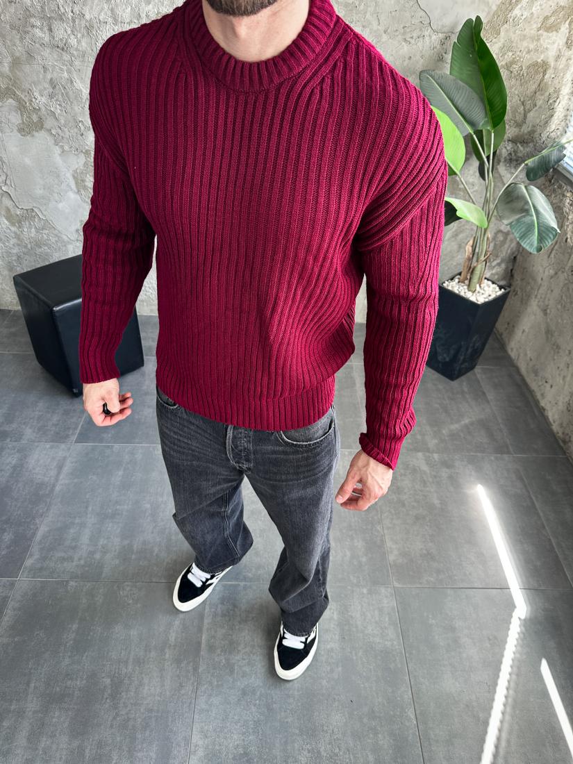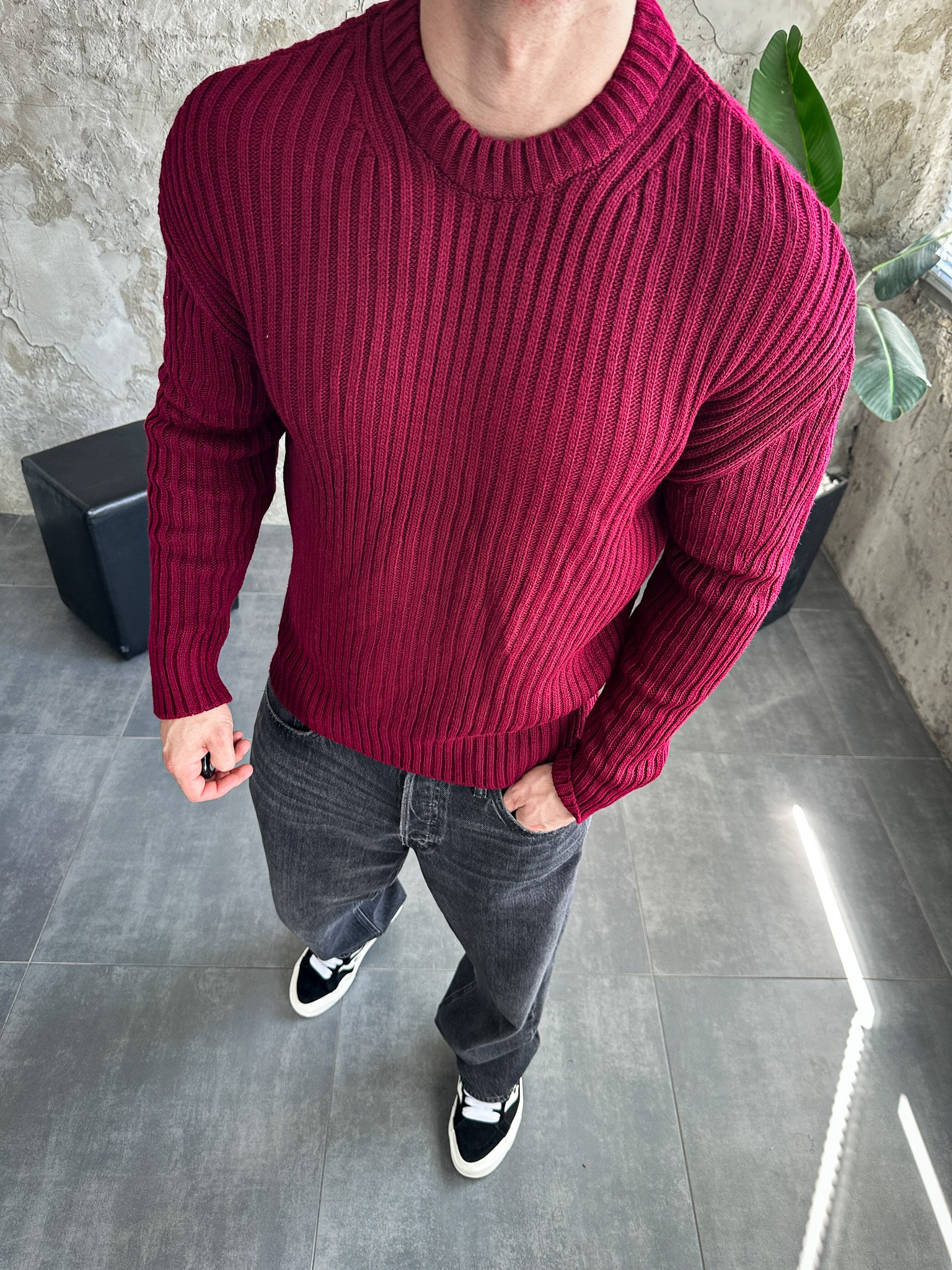 Мужской Теплый Базовый Бордовый Свитер Свободного Кроя со Спущенным Плечом
