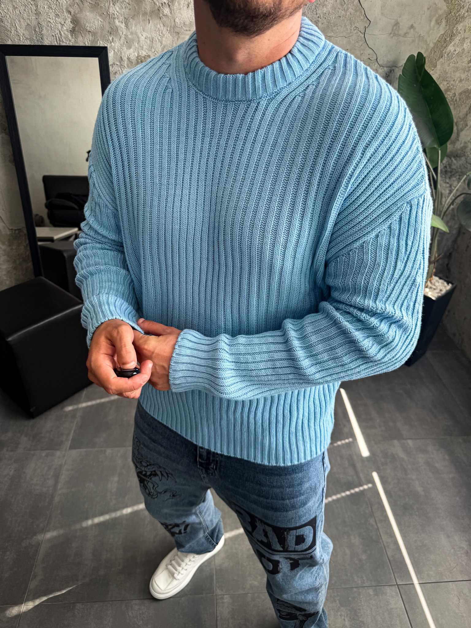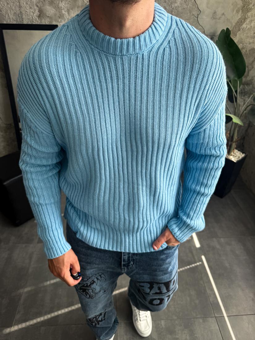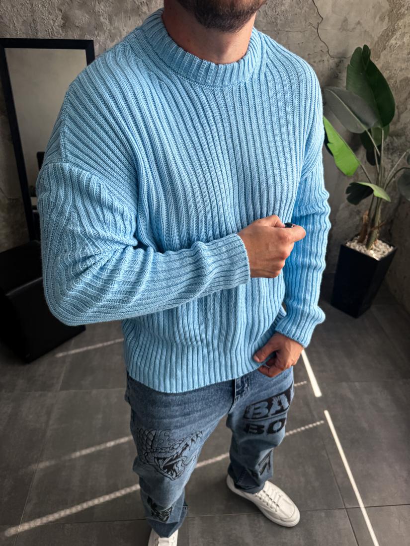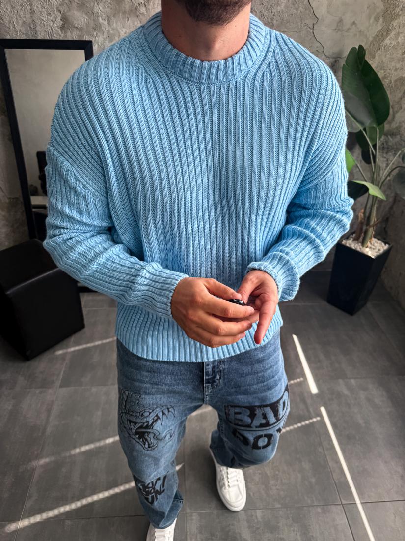 Мужской Теплый Базовый Голубой Свитер Свободного Кроя со Спущенным Плечом