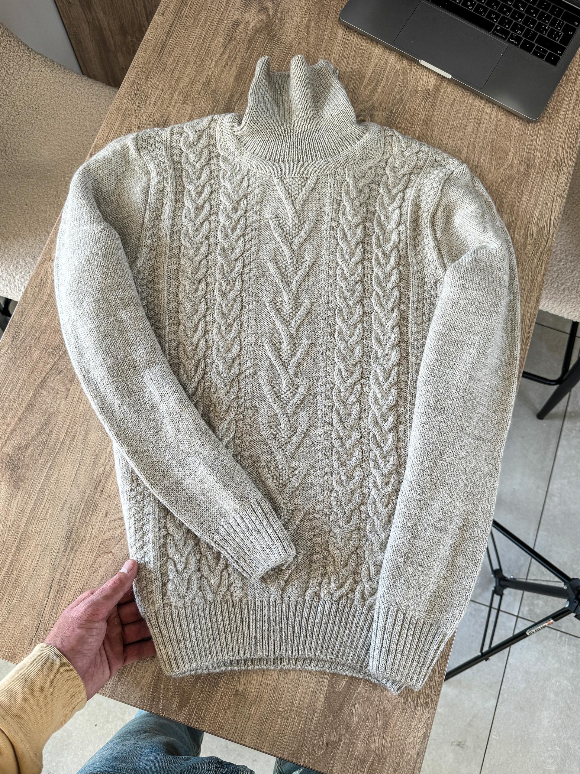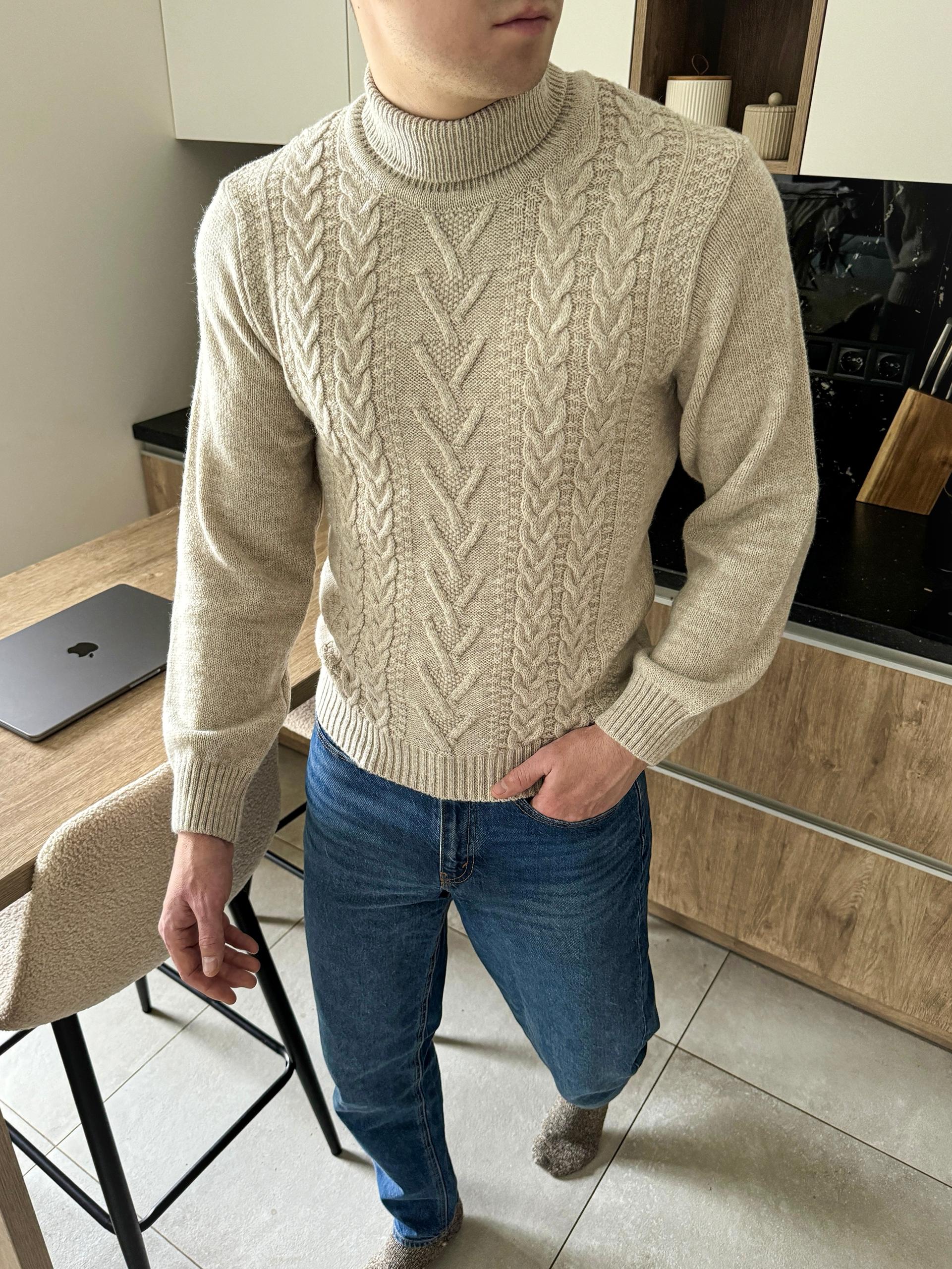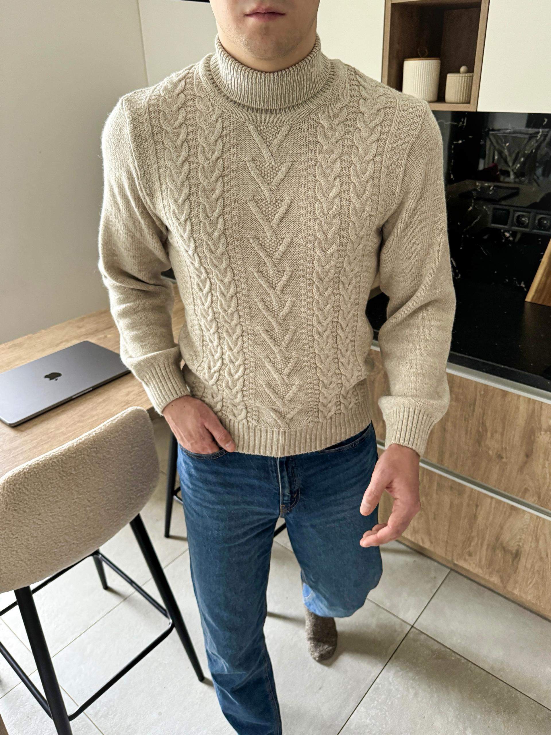 Мужской Теплый Шерстяной Бежевый Свитер Гольф Косичка с Отворотом на Горловине