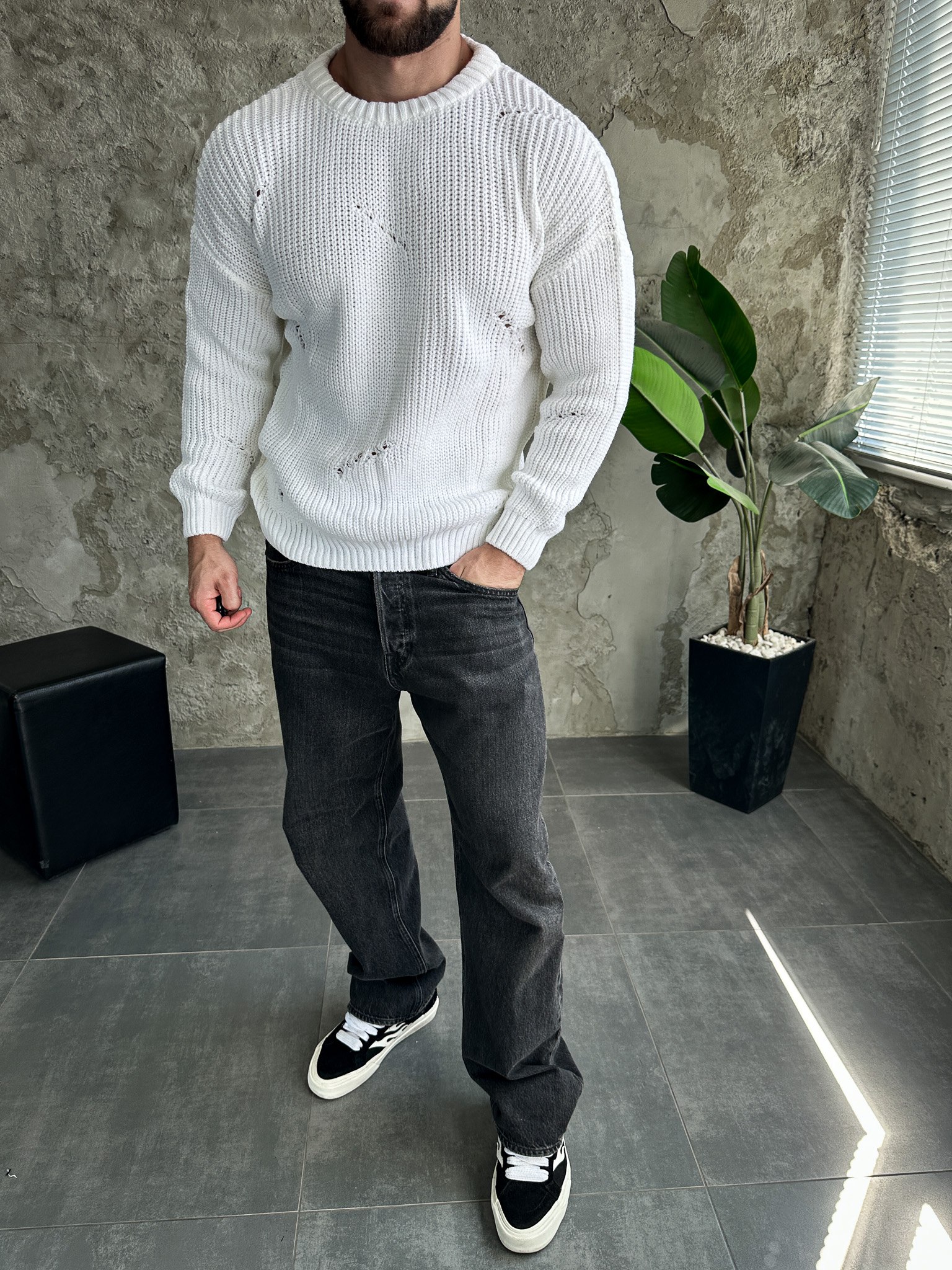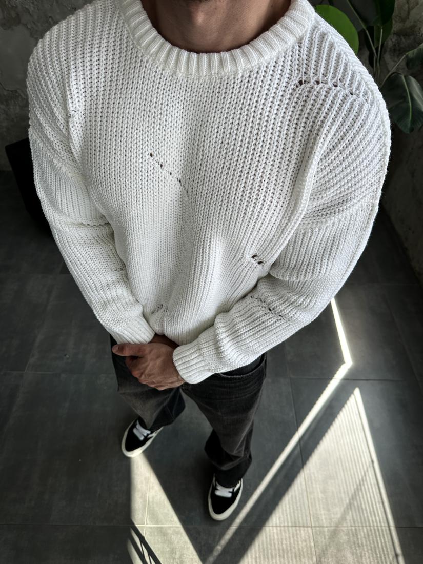 Мужской Теплый Вязаный Белый Свитер Оверсайз Рваный