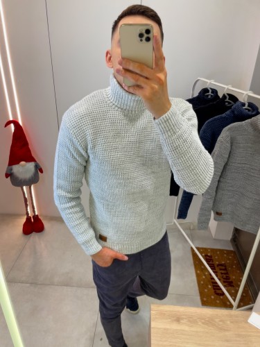 Мужской Вязаный Светло-Серый Свитер Гольф с Двойным Горлом