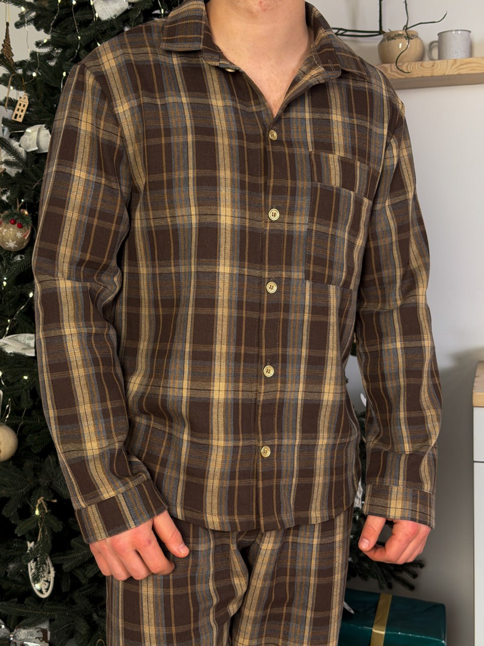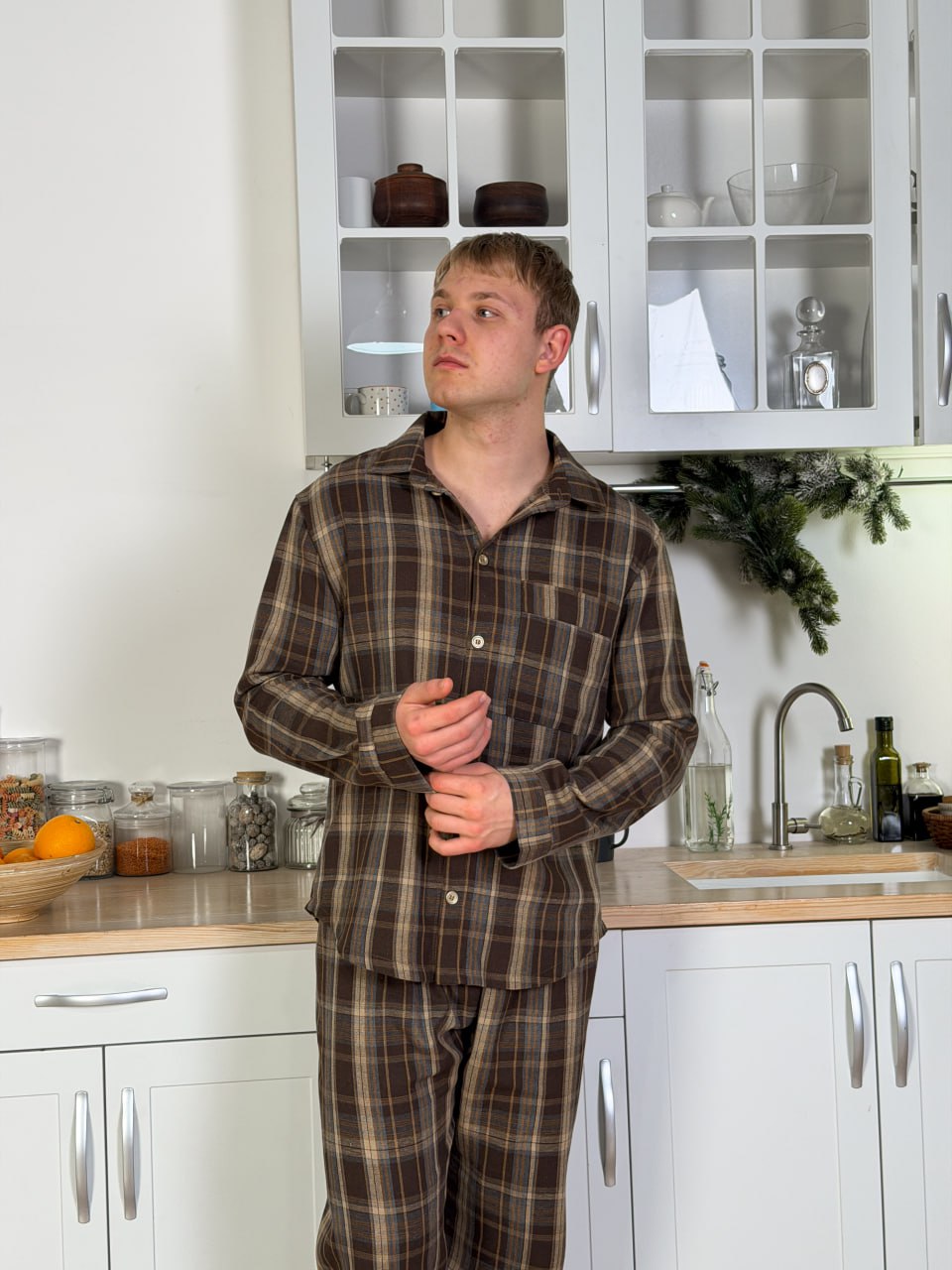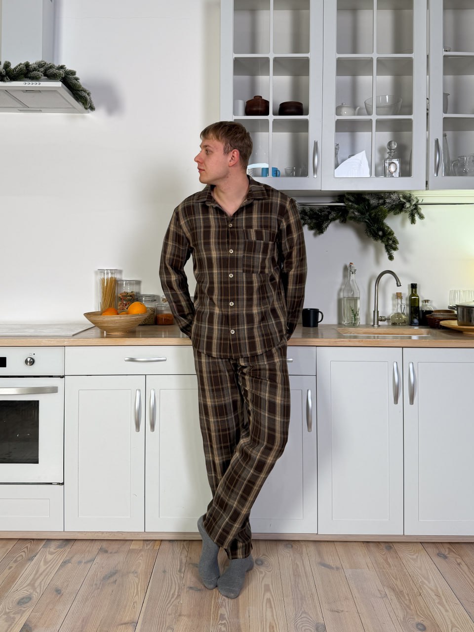 Мужская Коричневая Клетчатая Пижама Двойка Хлопок