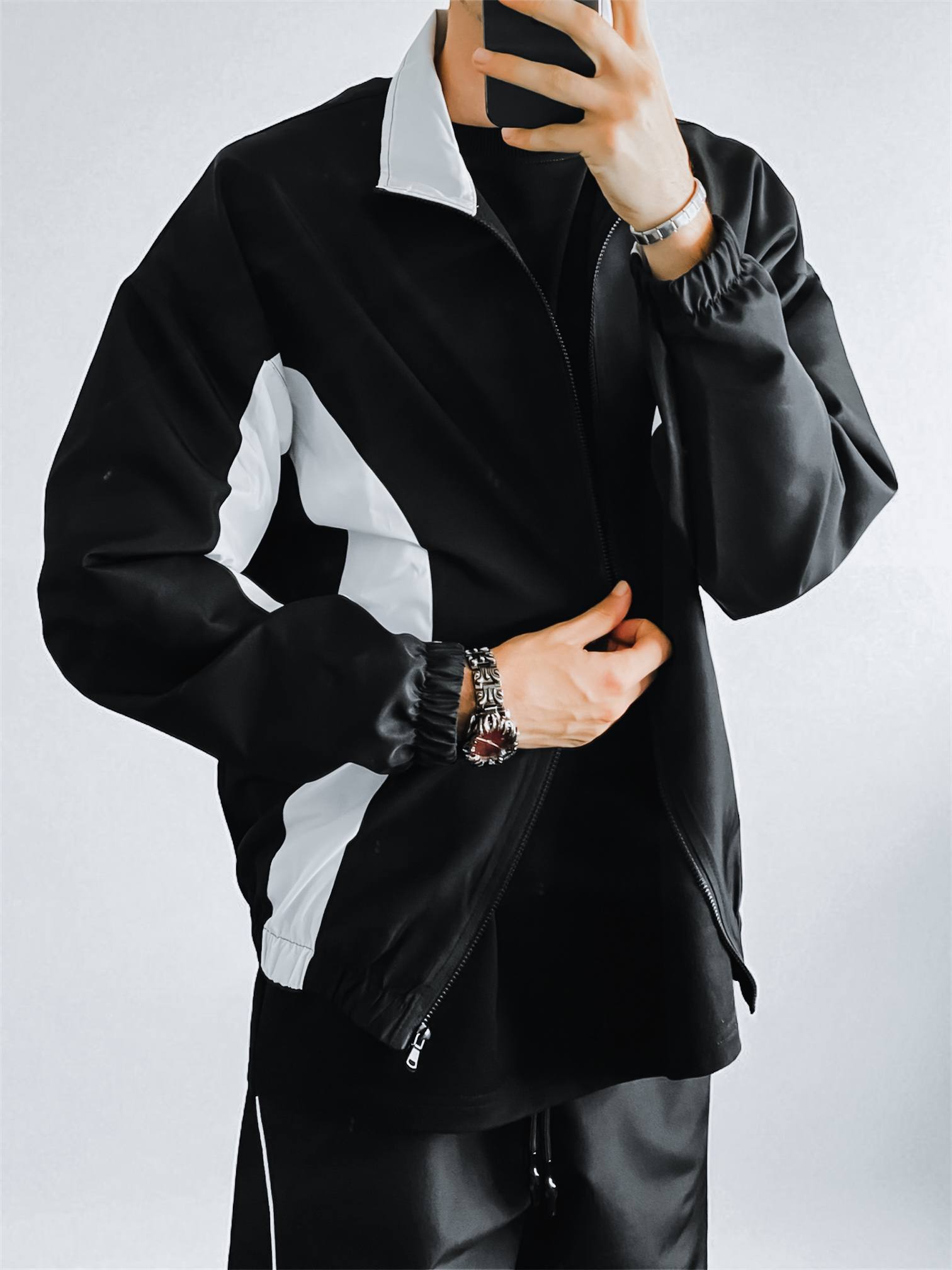Мужская Черная Ветровка с Белыми Вставками – Свободная под Горло на Молнии
