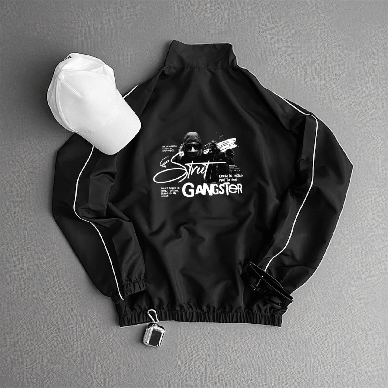 Мужская Свободная Черная Ветровка Олимпийка с Кантом и Принтом на Спине “Street Gangster”
