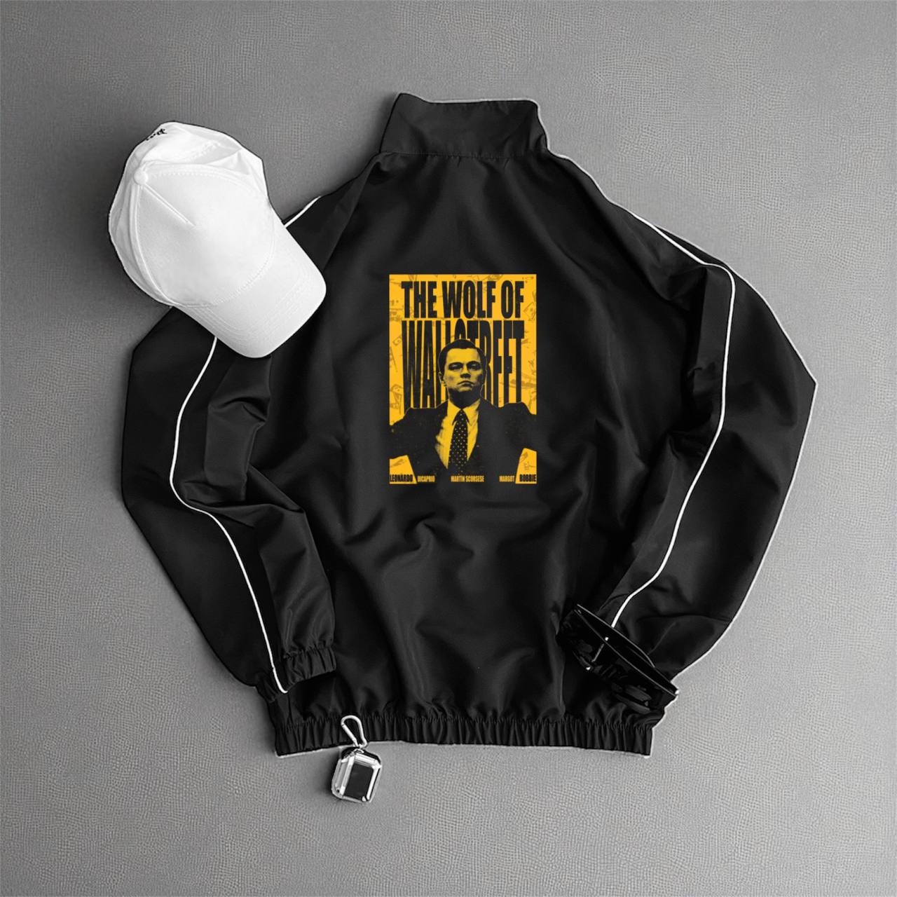 Мужская Свободная Черная Ветровка Олимпийка с Кантом и Принтом на Спине “Волк с Уолл-стрит”