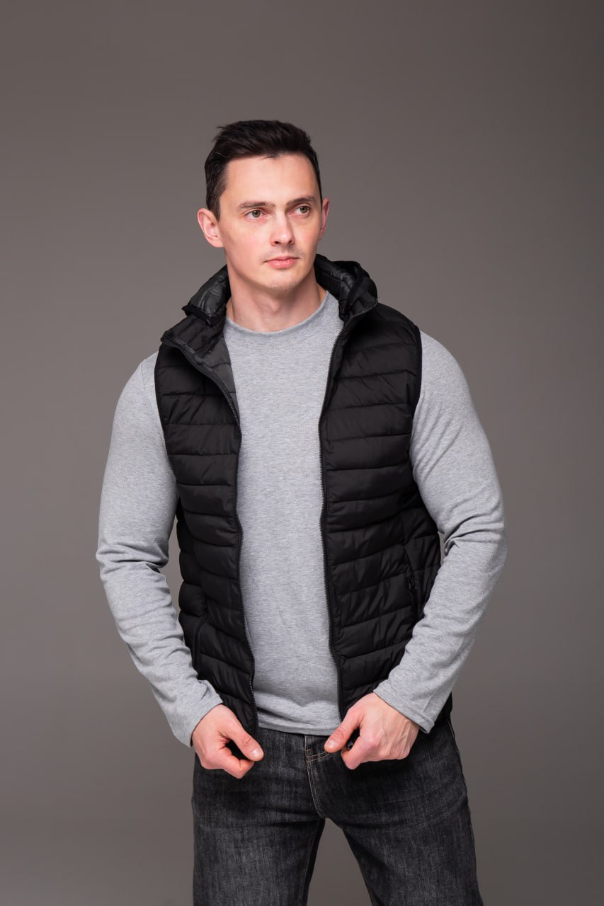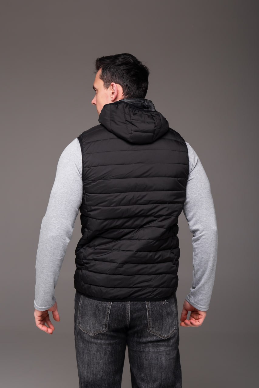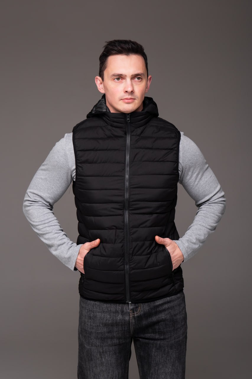 Мужская Базовая Стеганая Черная Жилетка Безрукавка с Капюшоном