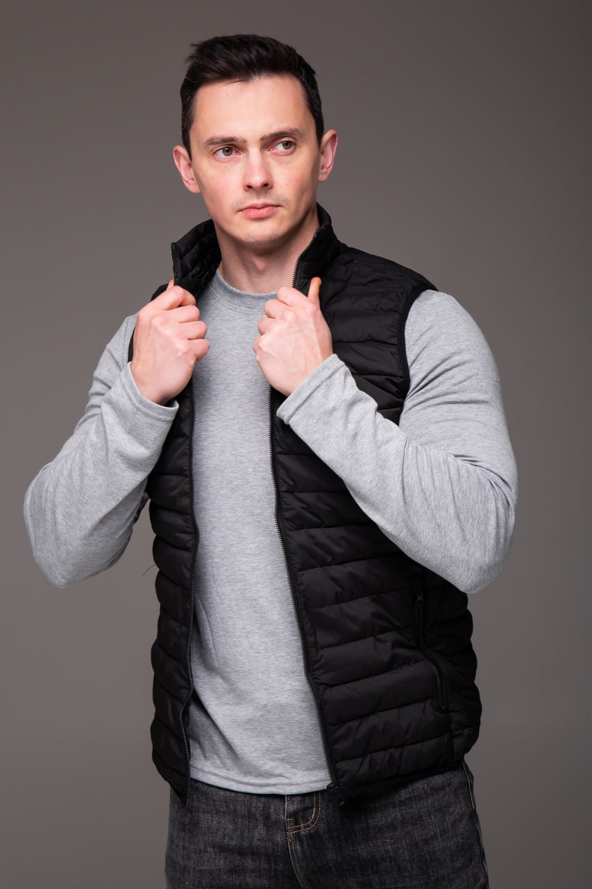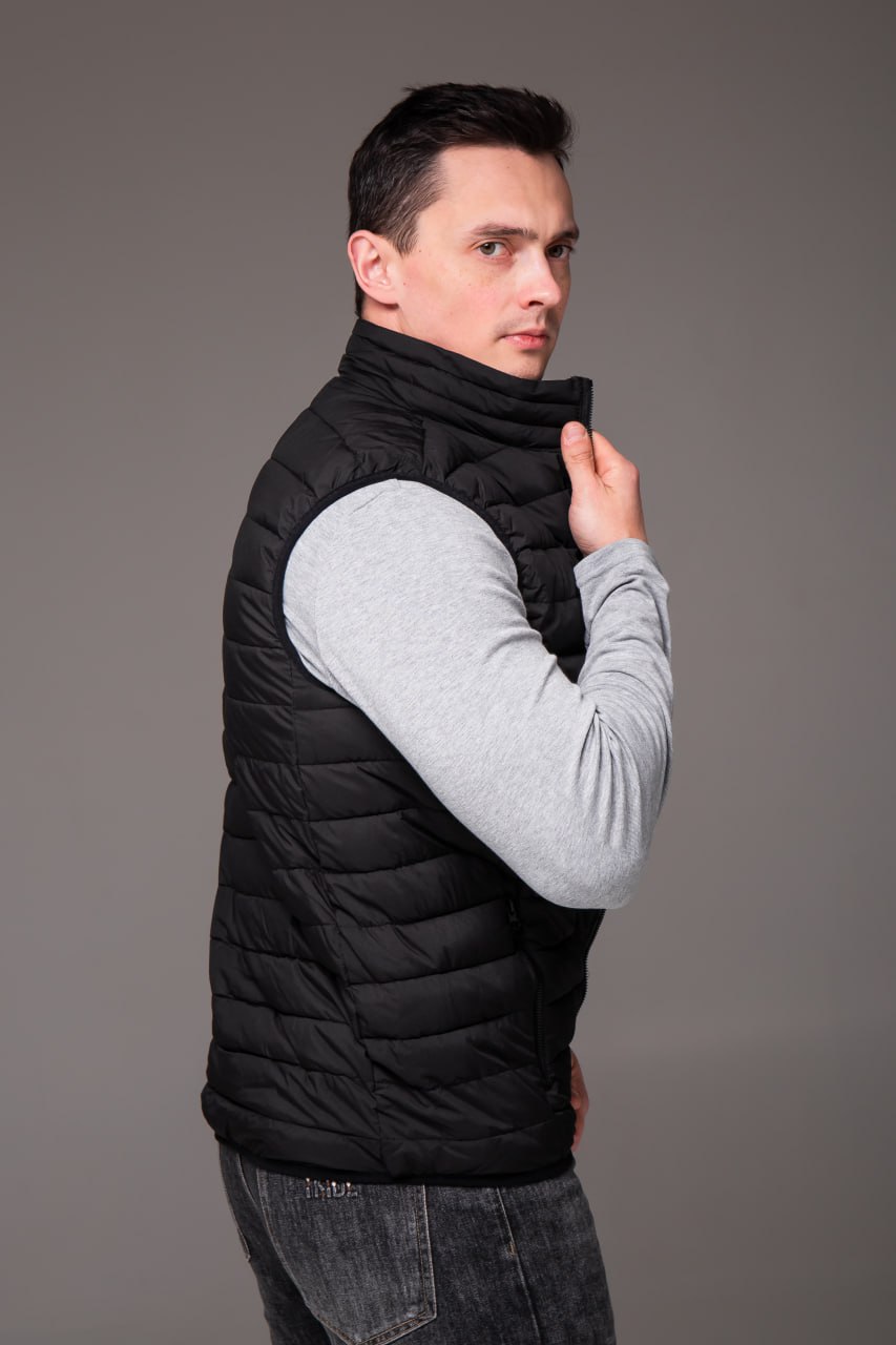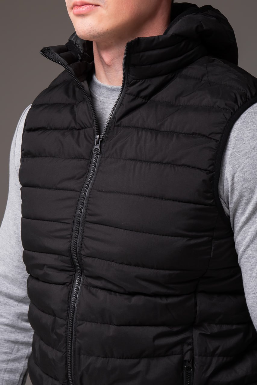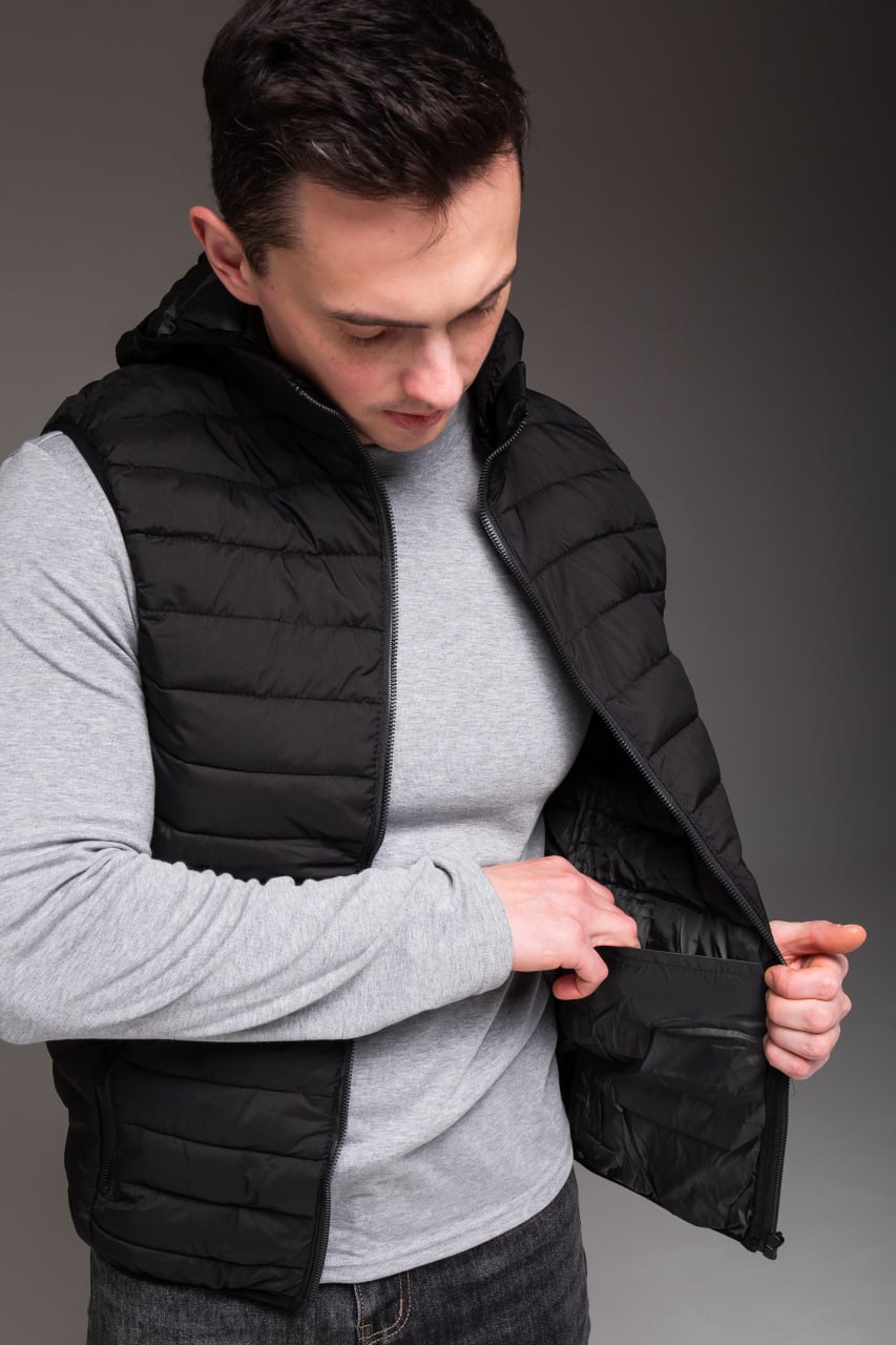 Мужская Базовая Стеганая Черная Жилетка Безрукавка с Капюшоном