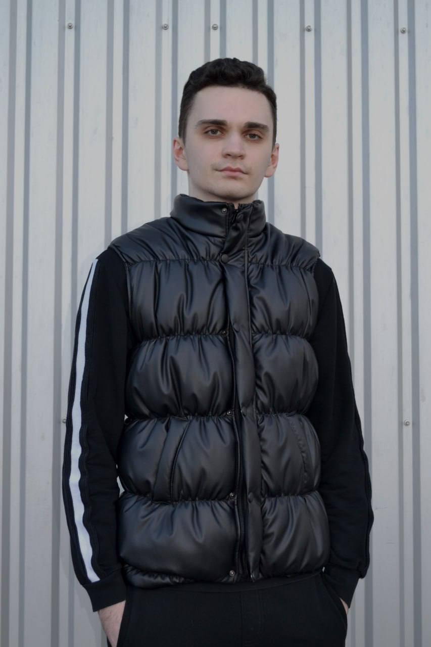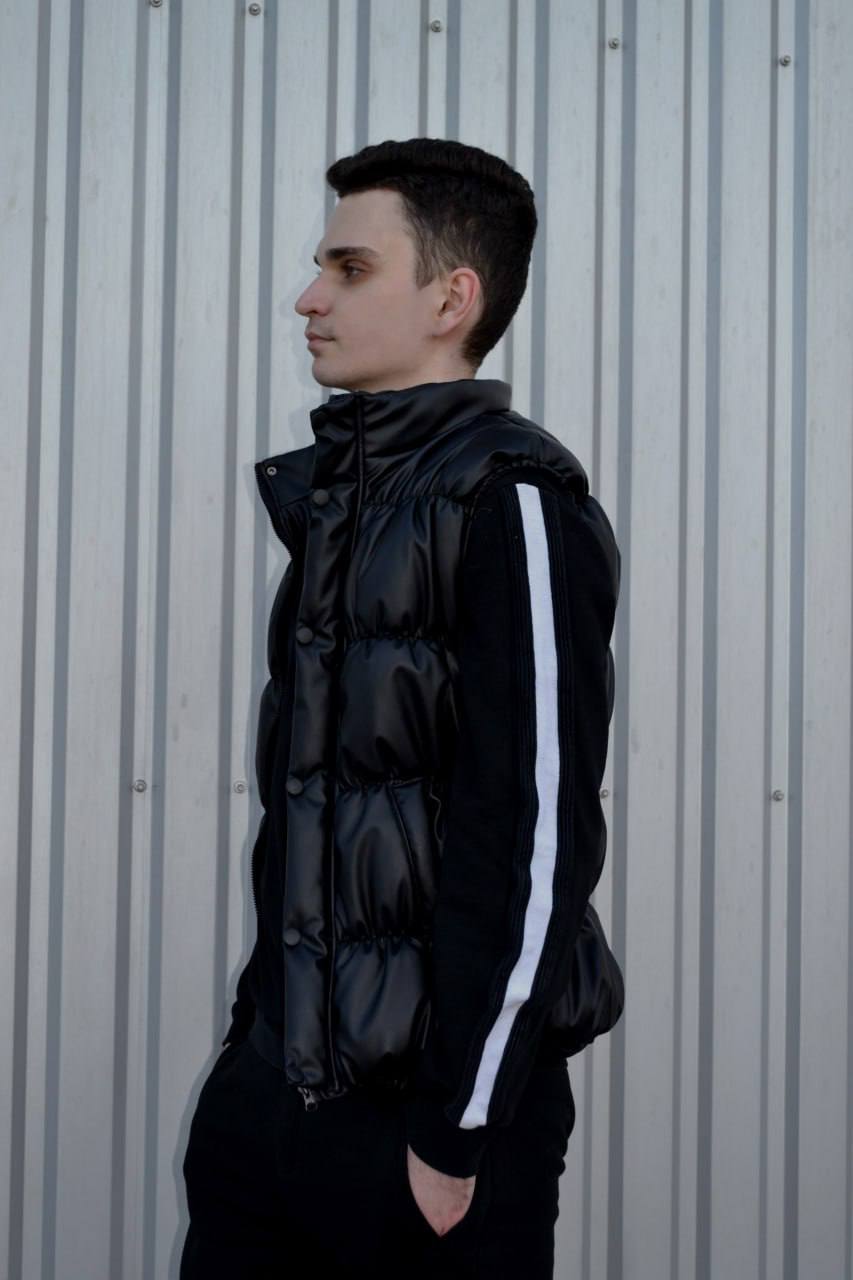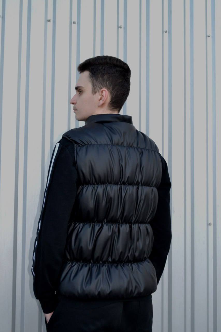 Мужской Демисезонный Кожаный Черный Жилет – Простроченная Безрукавка на Пуху с Воротником Стойкой