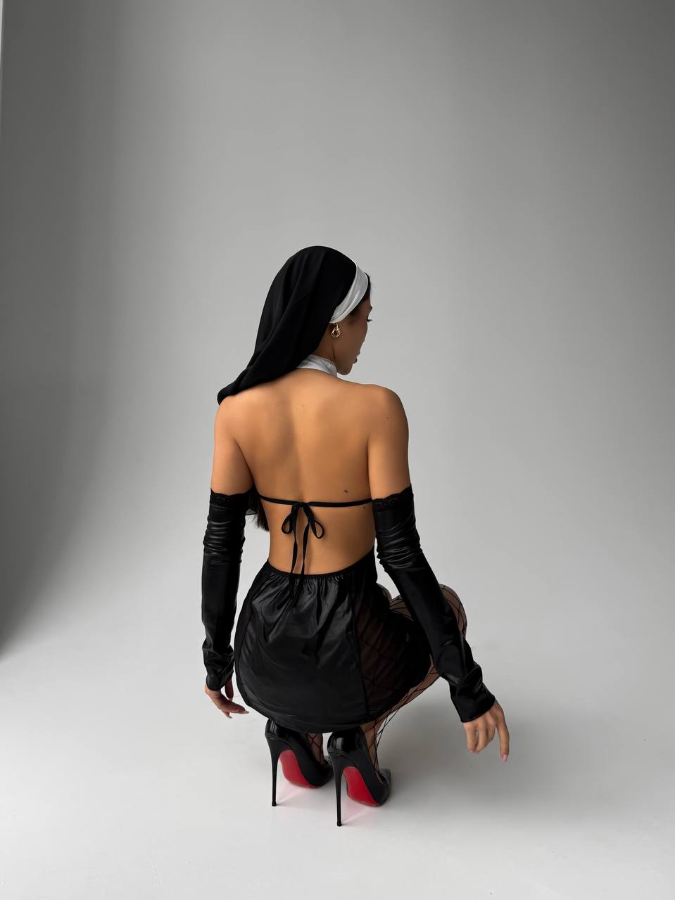 Женский Черный Ролевой Костюм Комплект Монашка – Платье + Трусики + Рукавички + Повязка на Голову