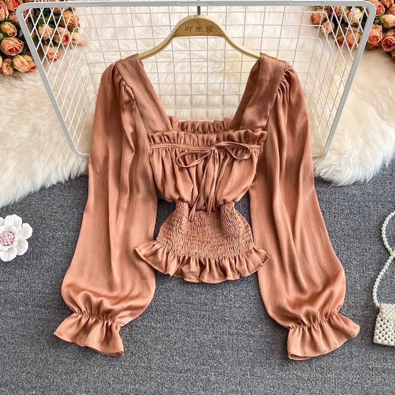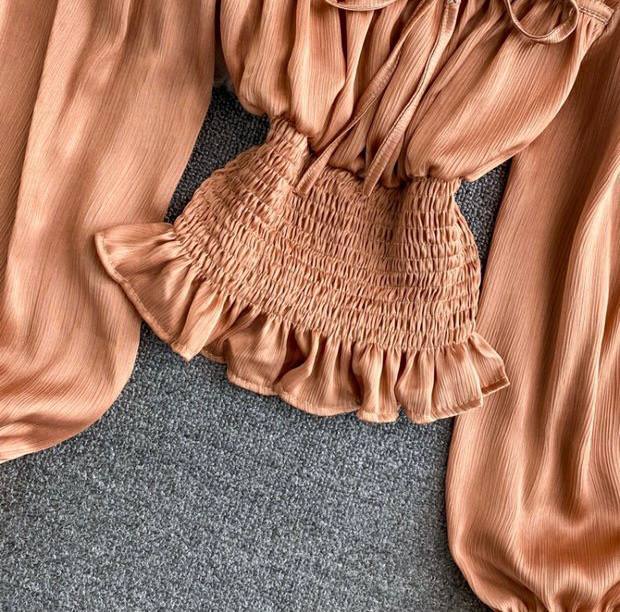Женская Блуза Мокко с Резинкой на Талии и Объемными Рукавами