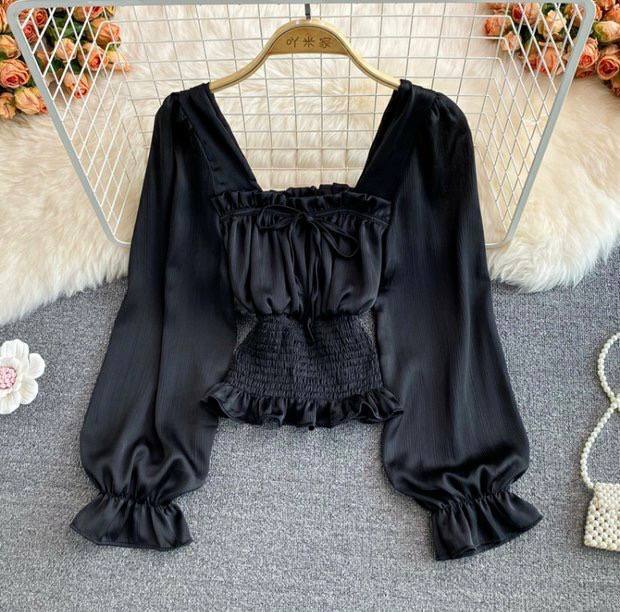 Женская Черная Блуза с Резинкой на Талии и Объемными Рукавами