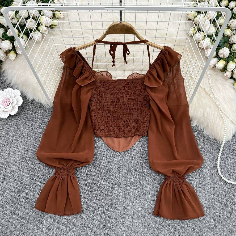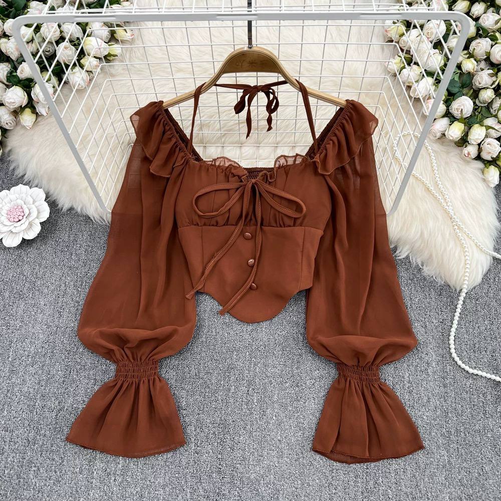 Женская Терракотовая Шифоновая Блуза с Объемными Рукавами и Имитацией Корсета