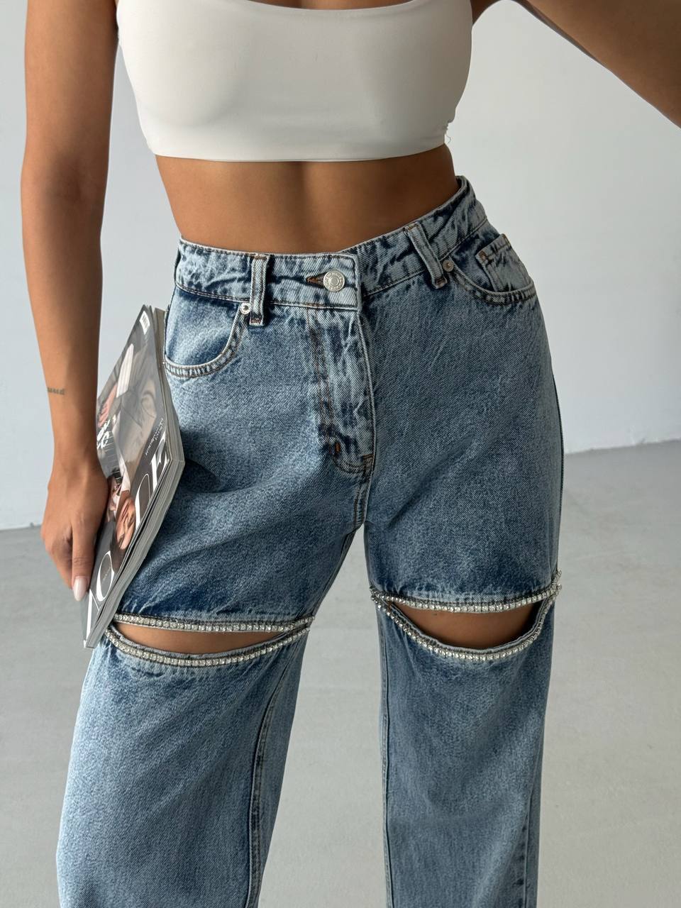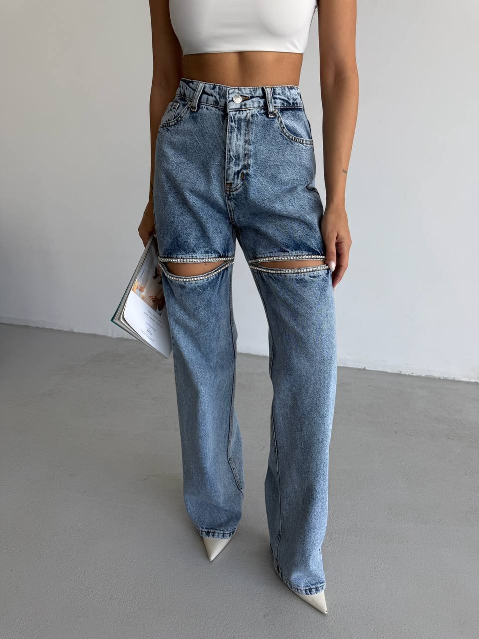 Женские Голубые Джинсы Палаццо с Вырезами Украшенные Стразами