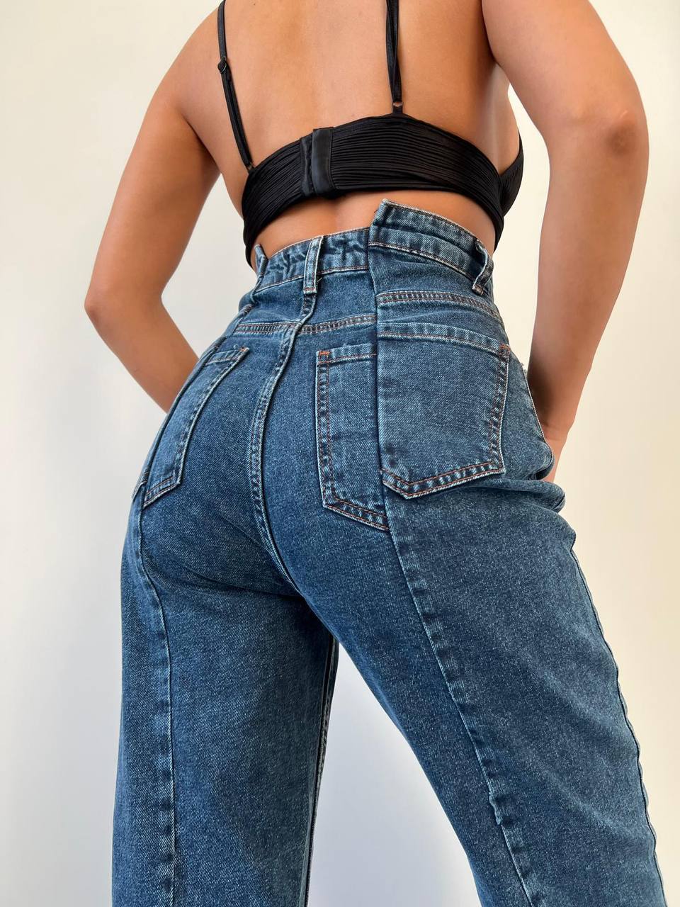 Женские Синие Джинсы Мом с Бахромой Внизу и Стрелками Швами Спереди