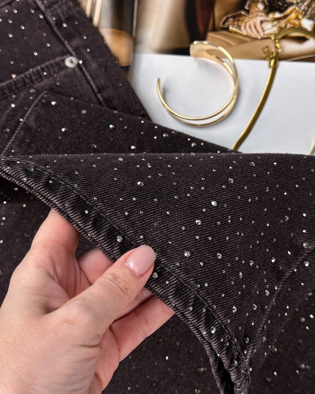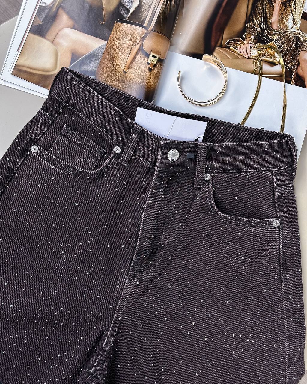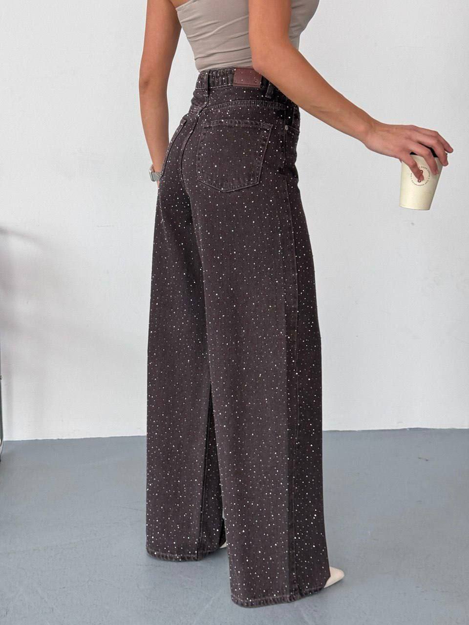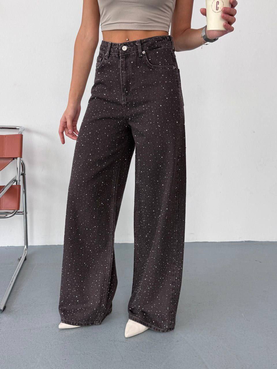 Женские Свободные Графитовые Джинсы Клеш со Стразами