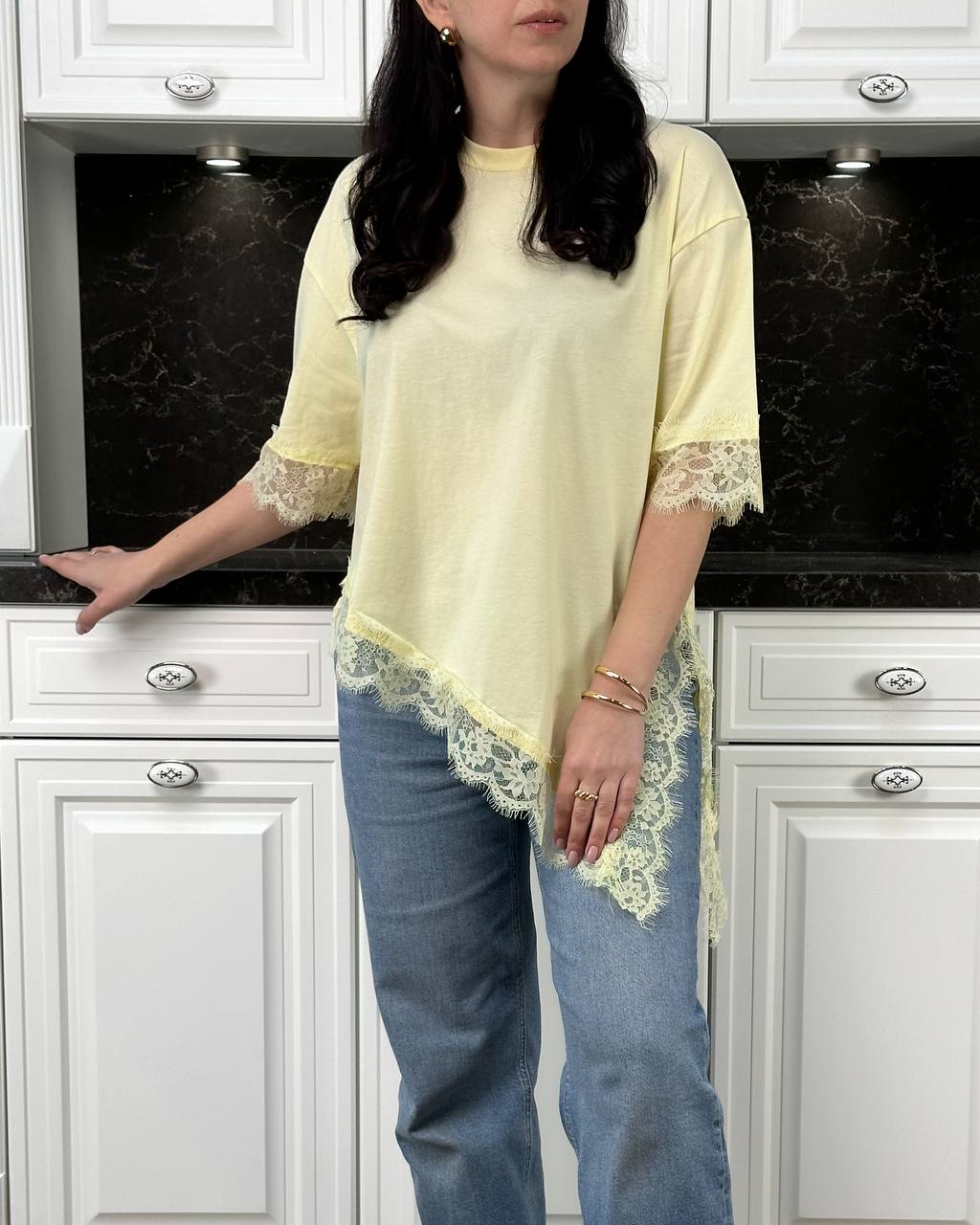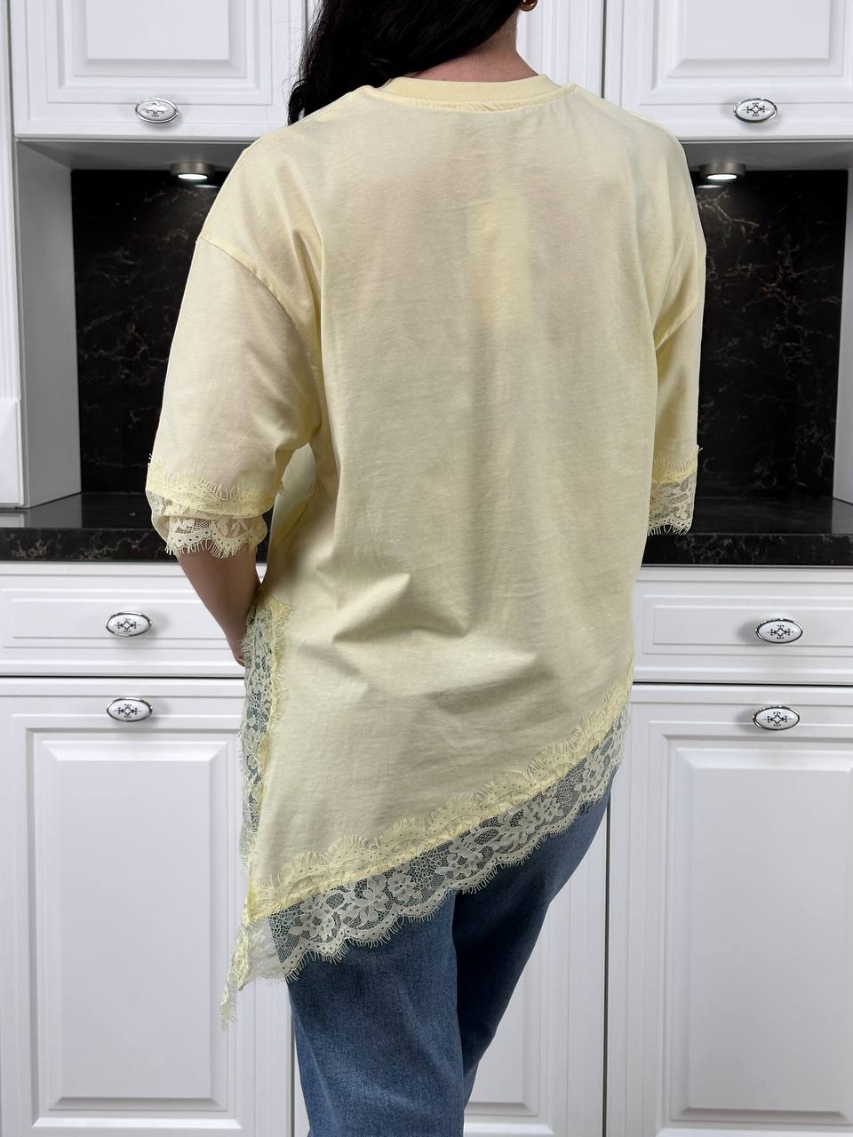 Женская Асимметричная Удлиненная Желтая Футболка Оверсайз с Кружевом по Краям