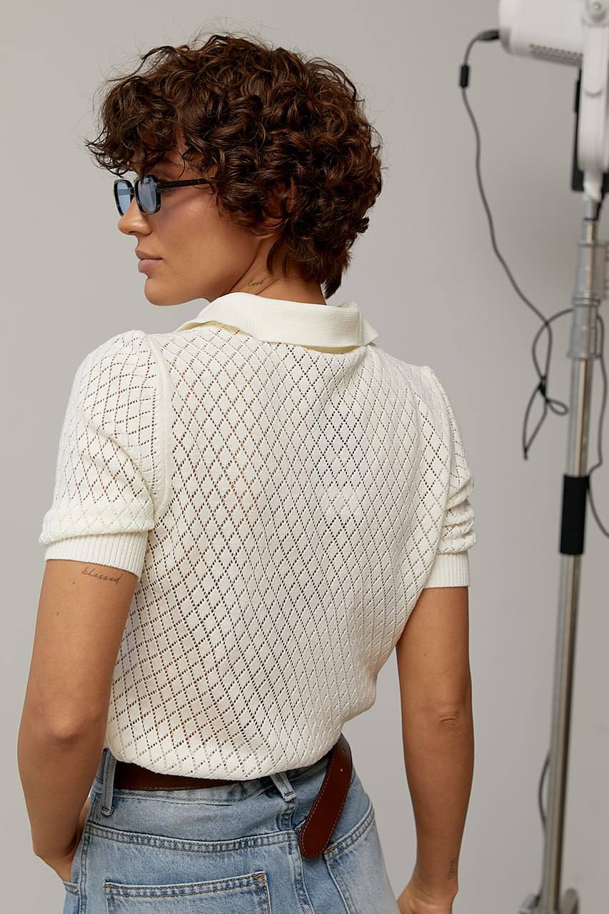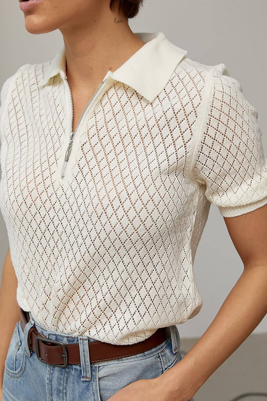 Женская Ажурная Белая Футболка Поло в Ромбик с Воротником на Замочке