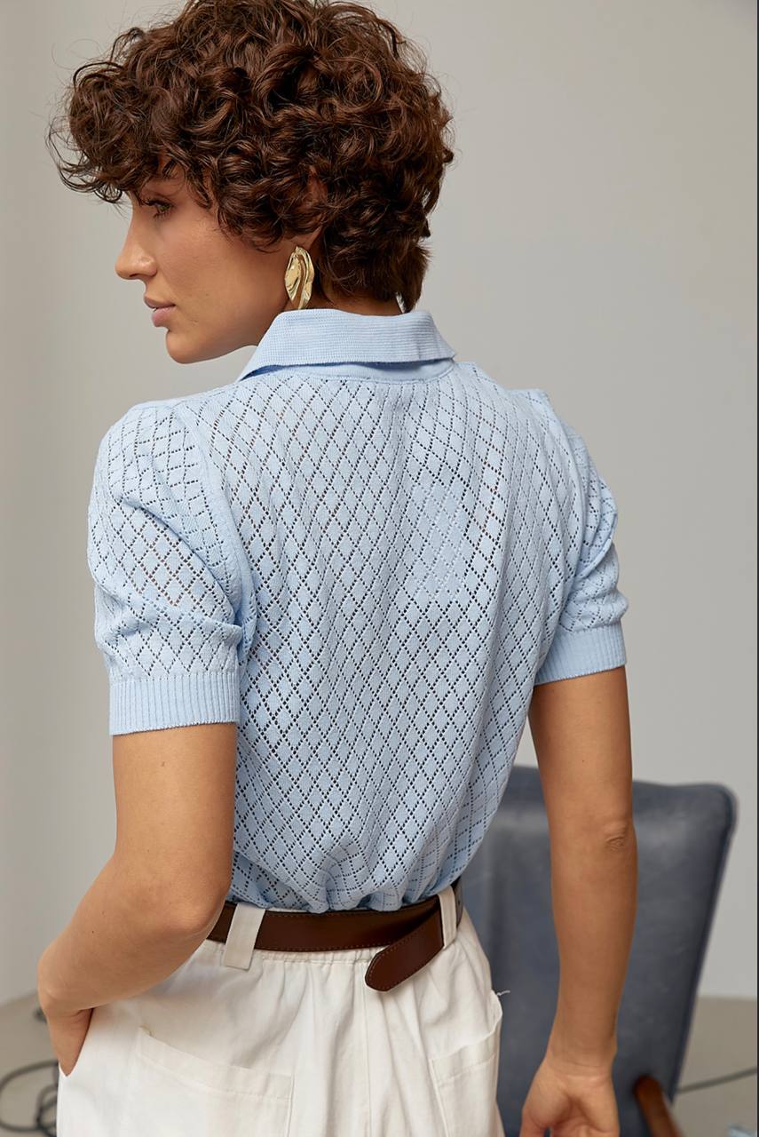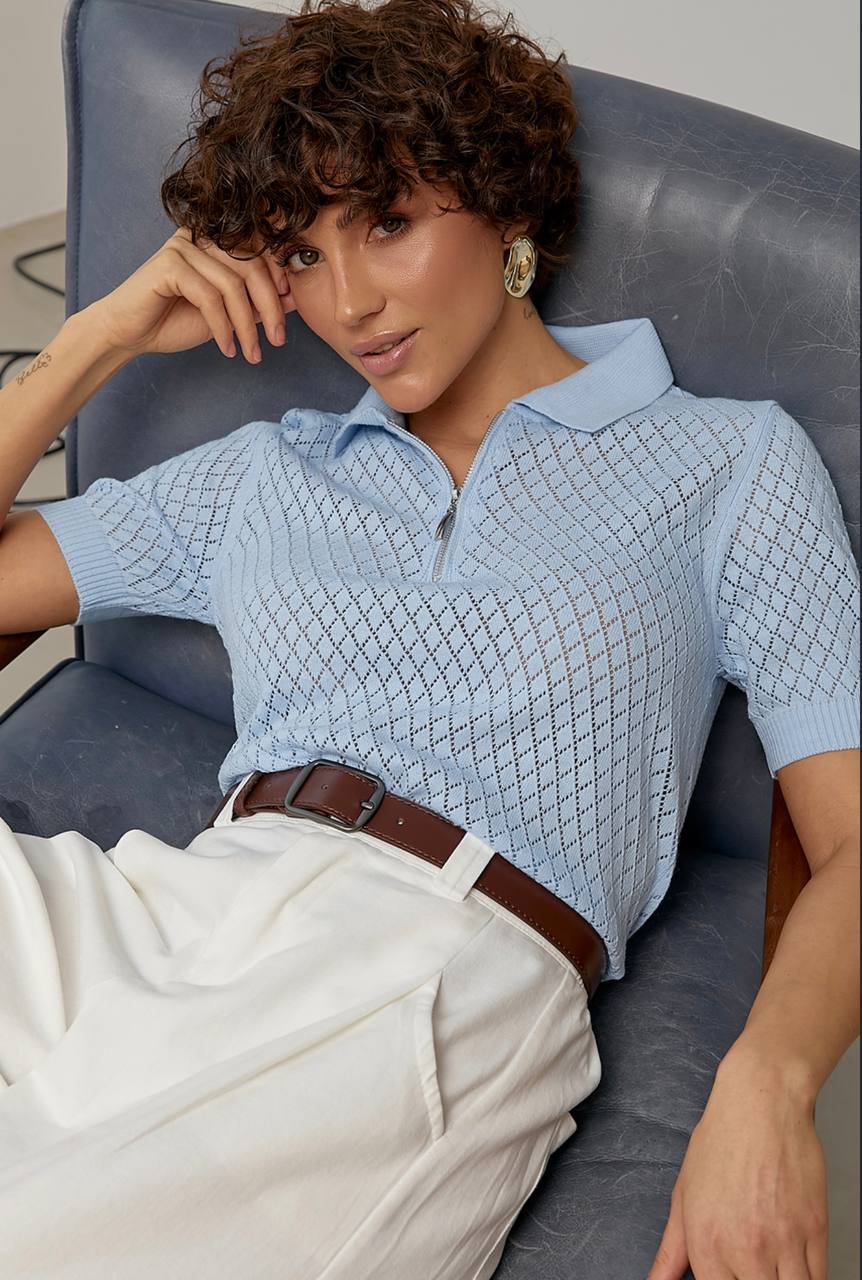 Женская Ажурная Голубая Футболка Поло в Ромбик с Воротником на Замочке