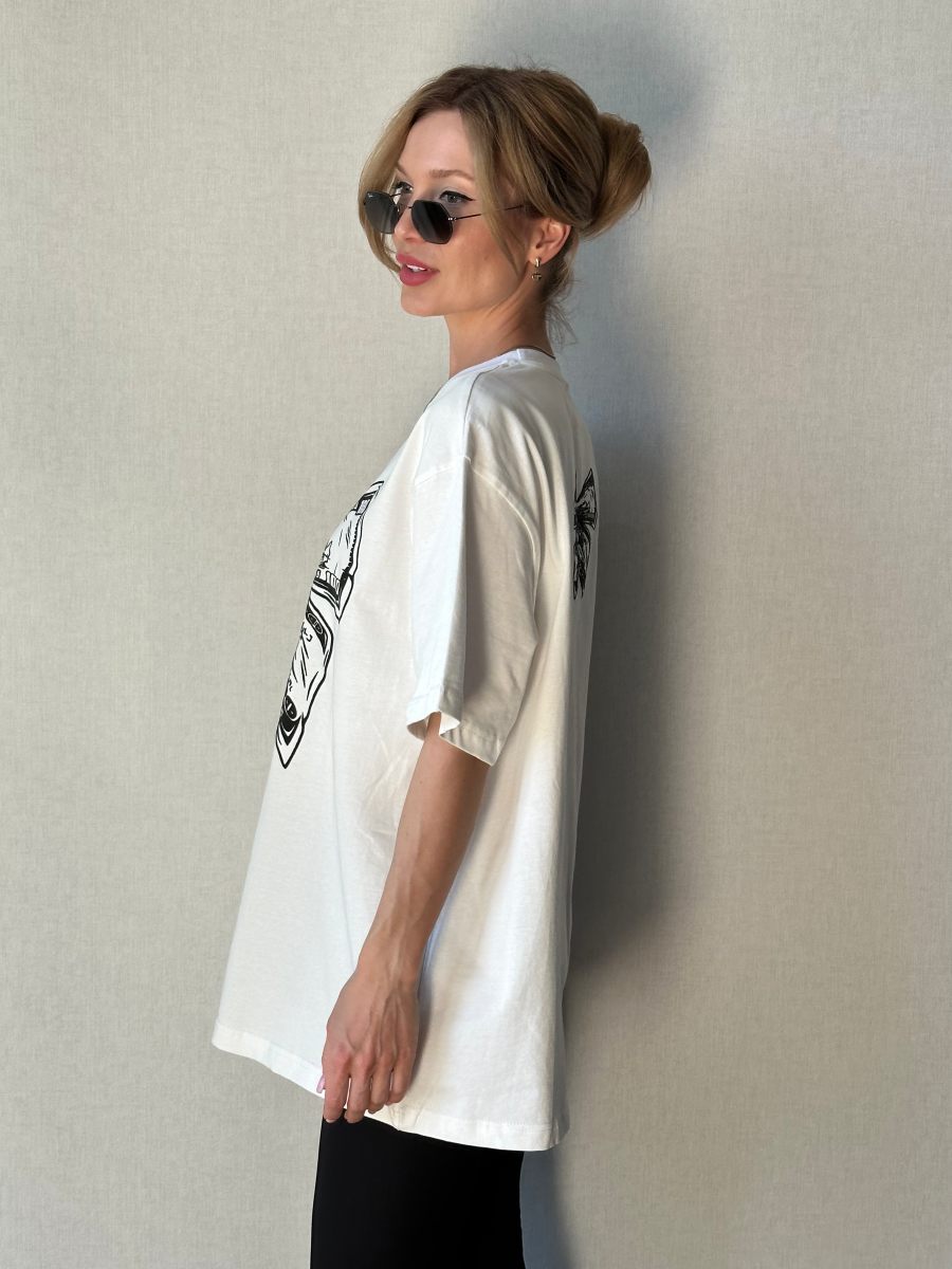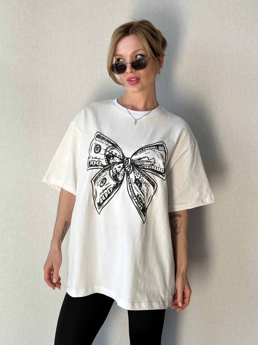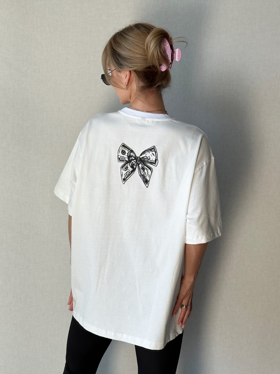 Женская Белая Футболка Объемная Оверсайз с Принтом Бантом