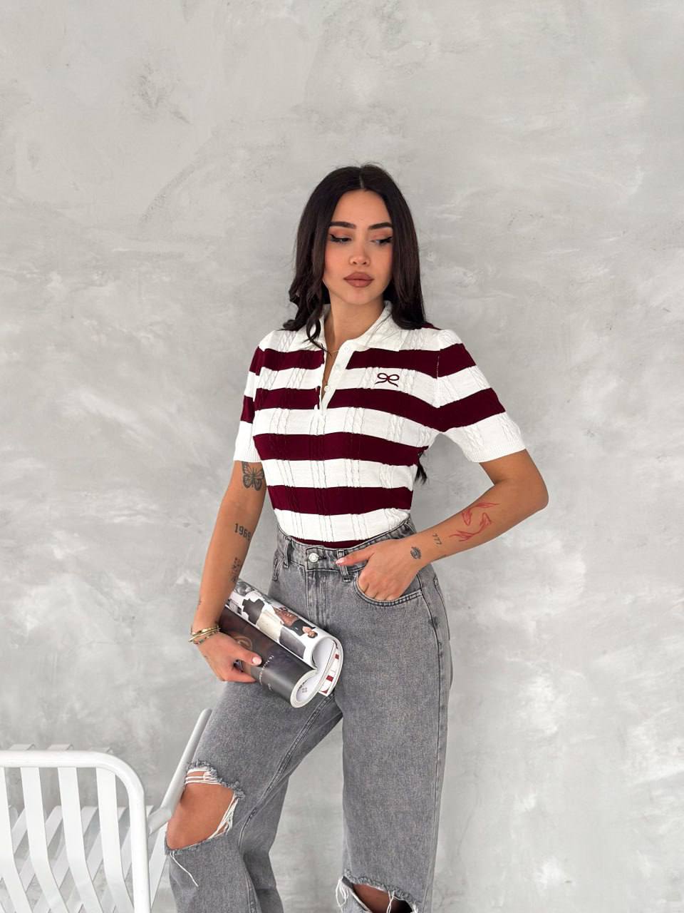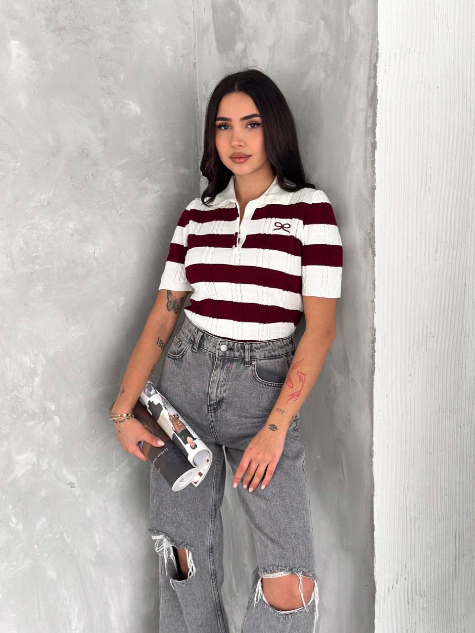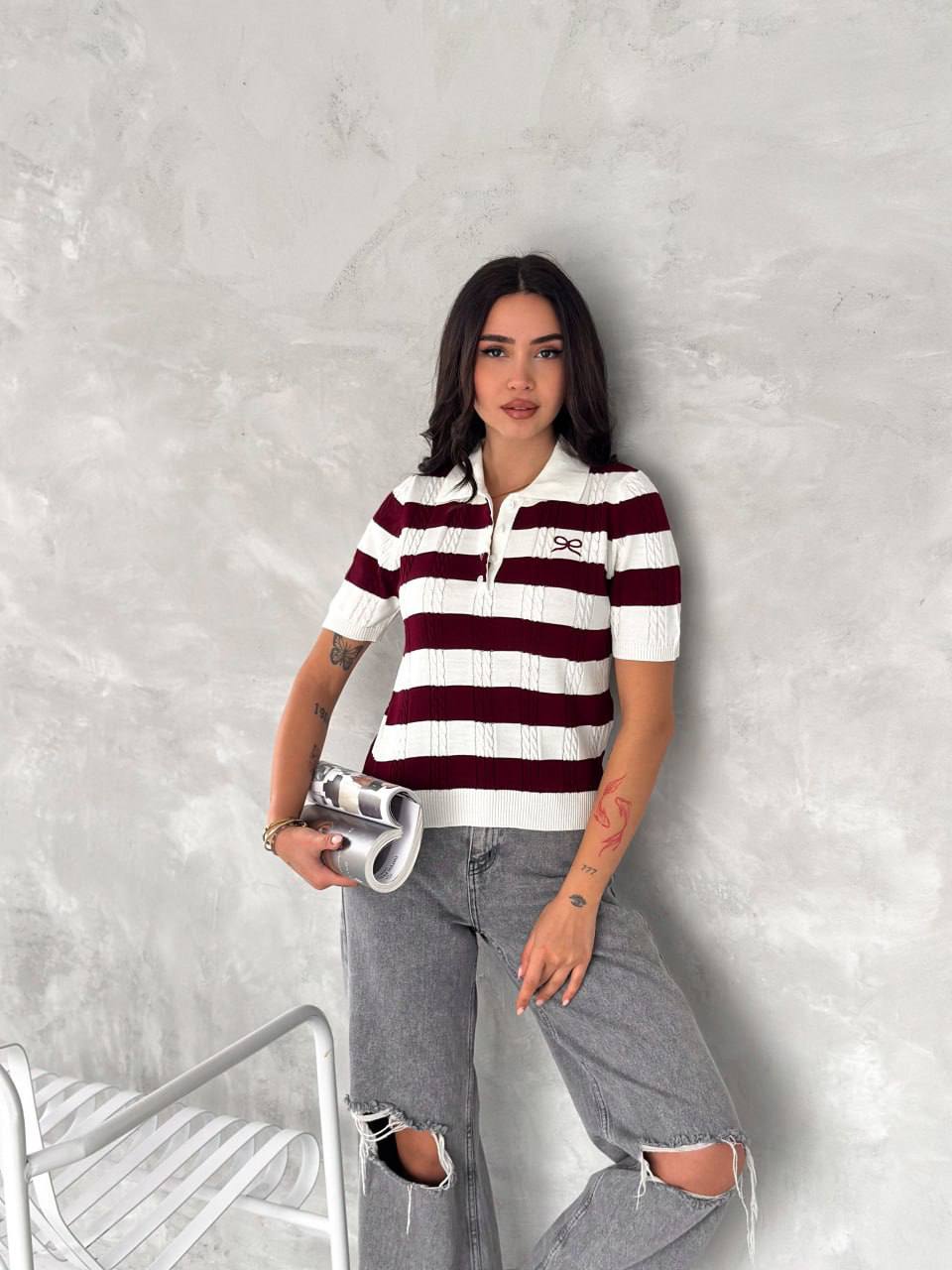 Женская Бордовая Футболка Поло в Широкую Полоску