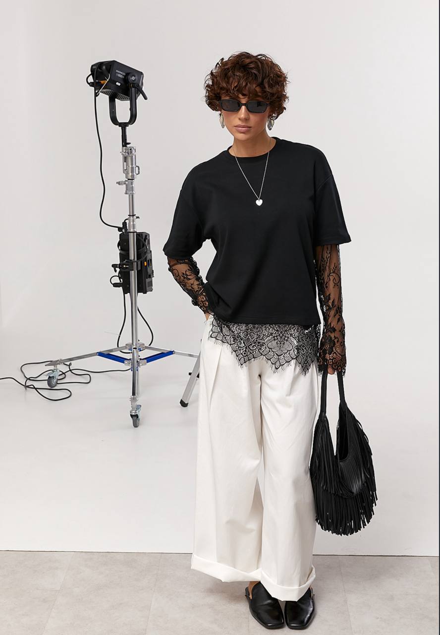 Женская Черная Футболка Оверсайз с Кружевными Рукавами и Обробкой Внизу