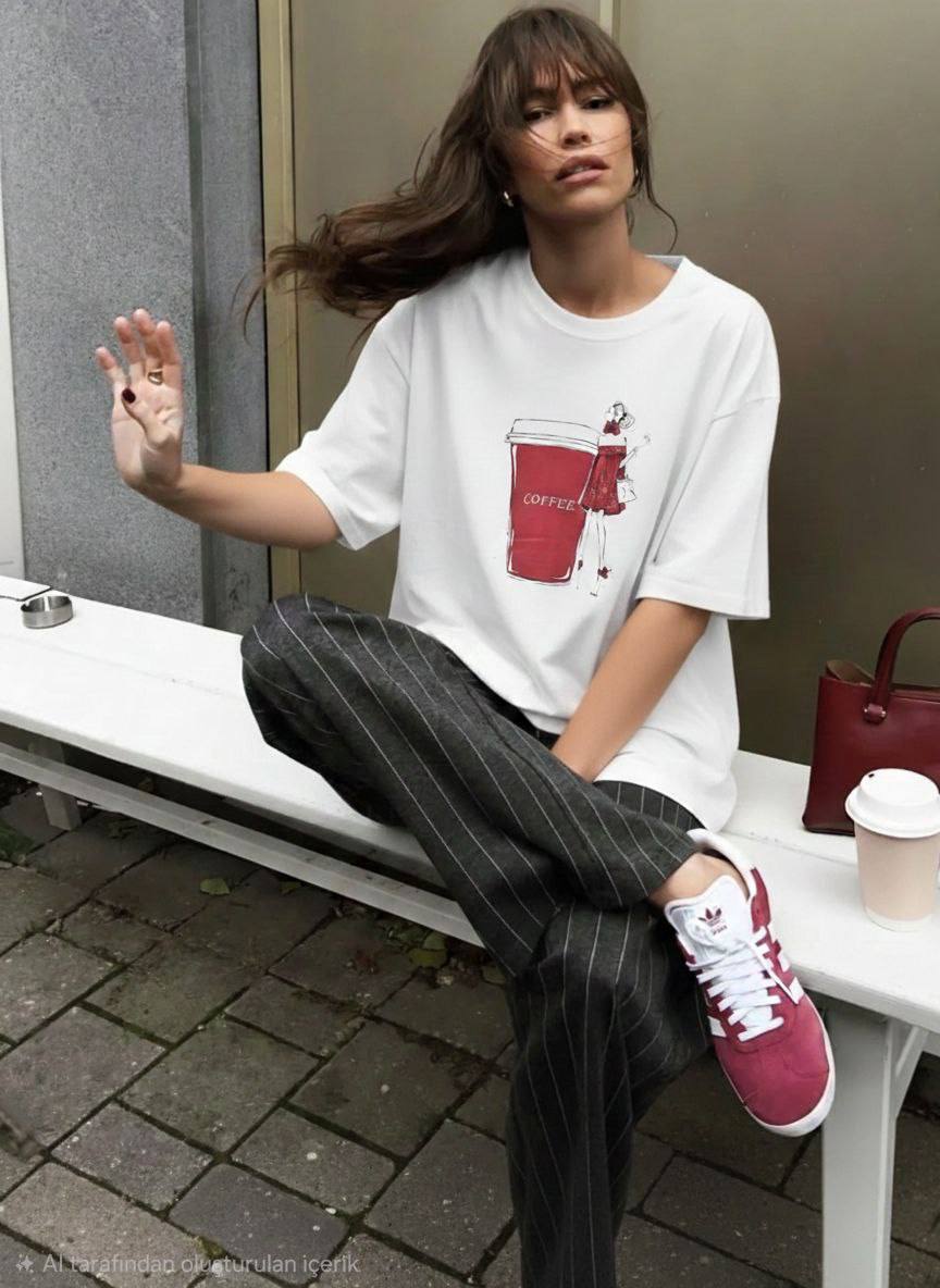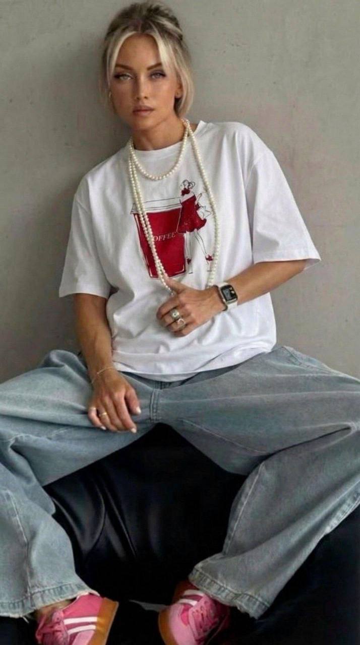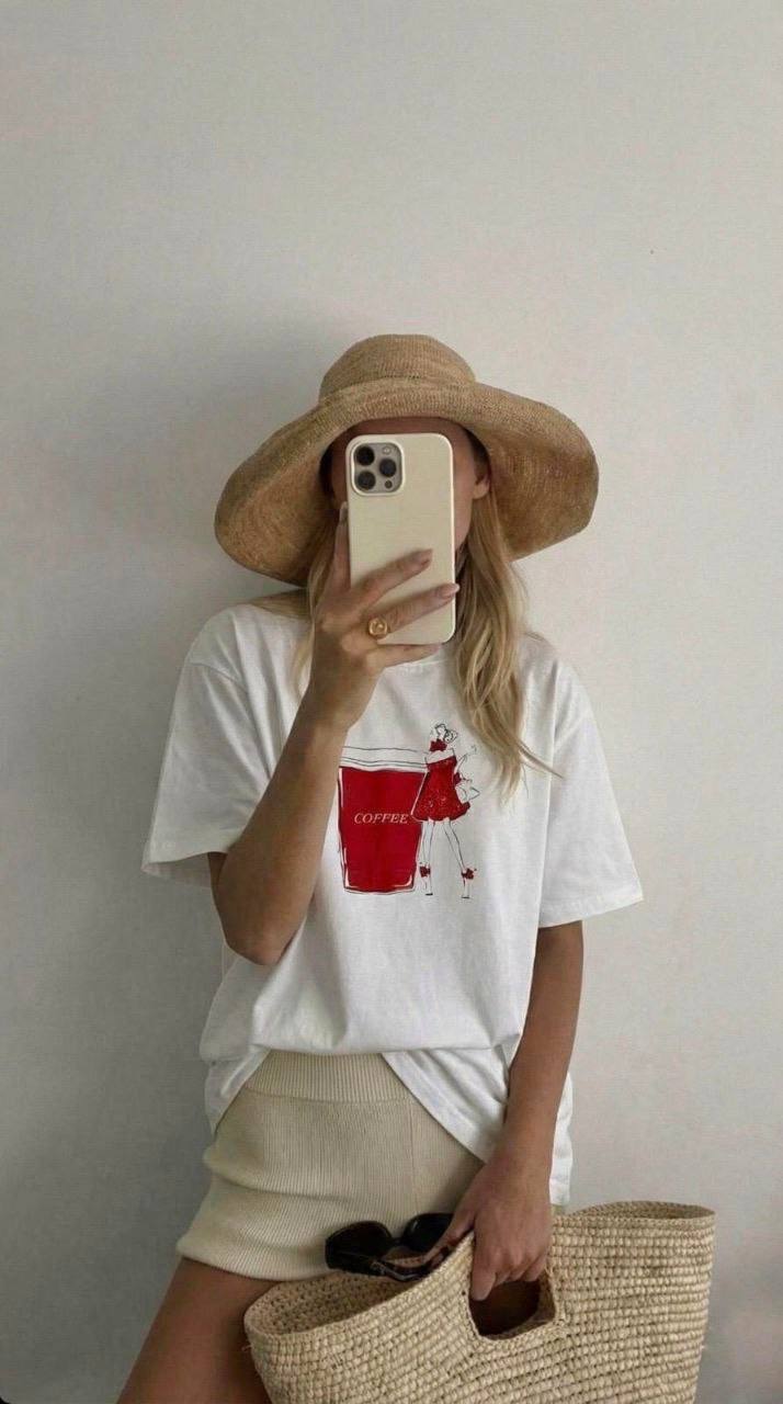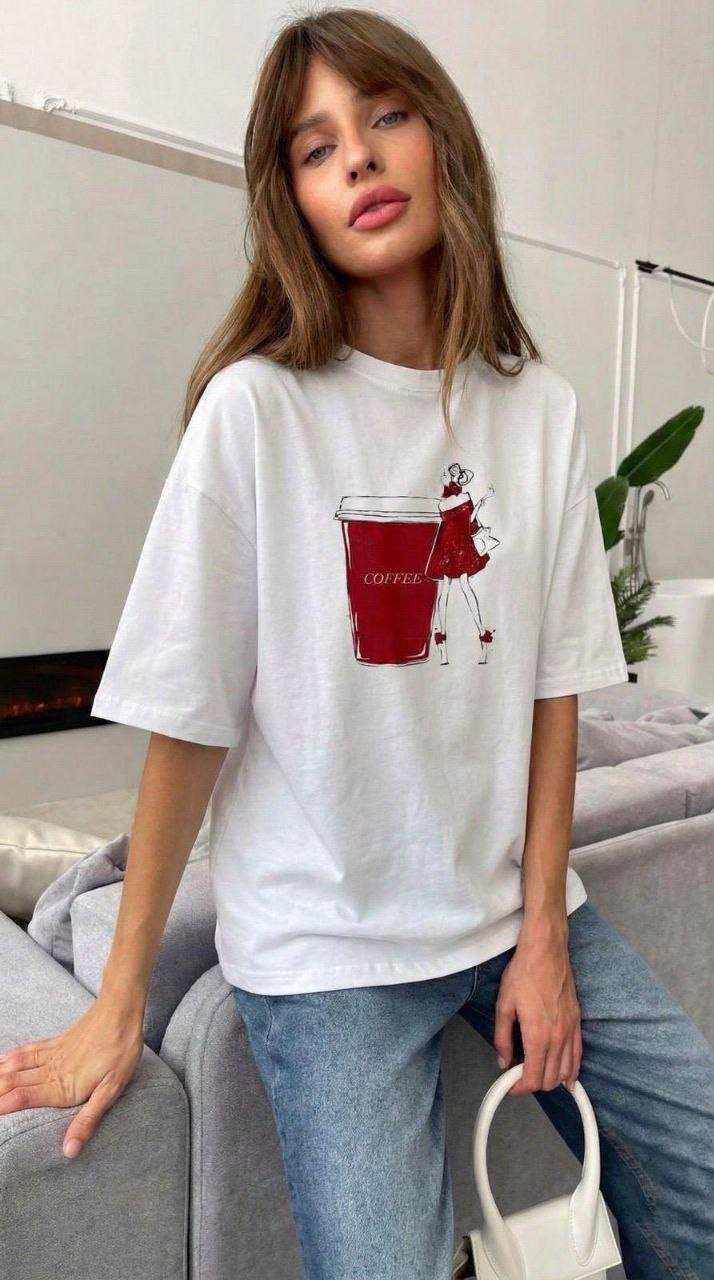 Женская Объемная Белая Футболка Оверсайз с Принтом “Coffee”