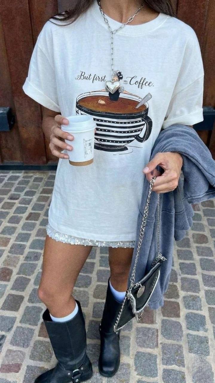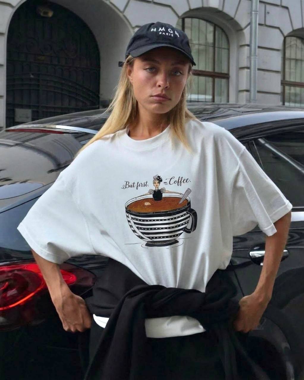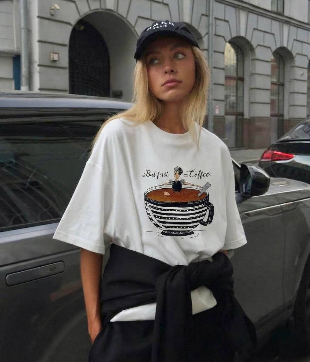 Женская Объемная Белая Футболка Оверсайз с Принтом Кофе