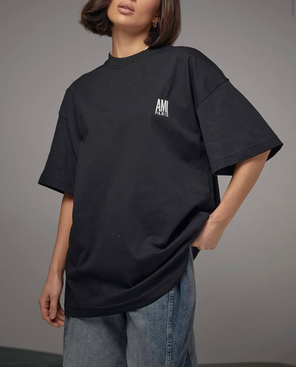 Женская Объемная Черная Футболка Оверсайз База с Маленькой Вышивкой на Груди