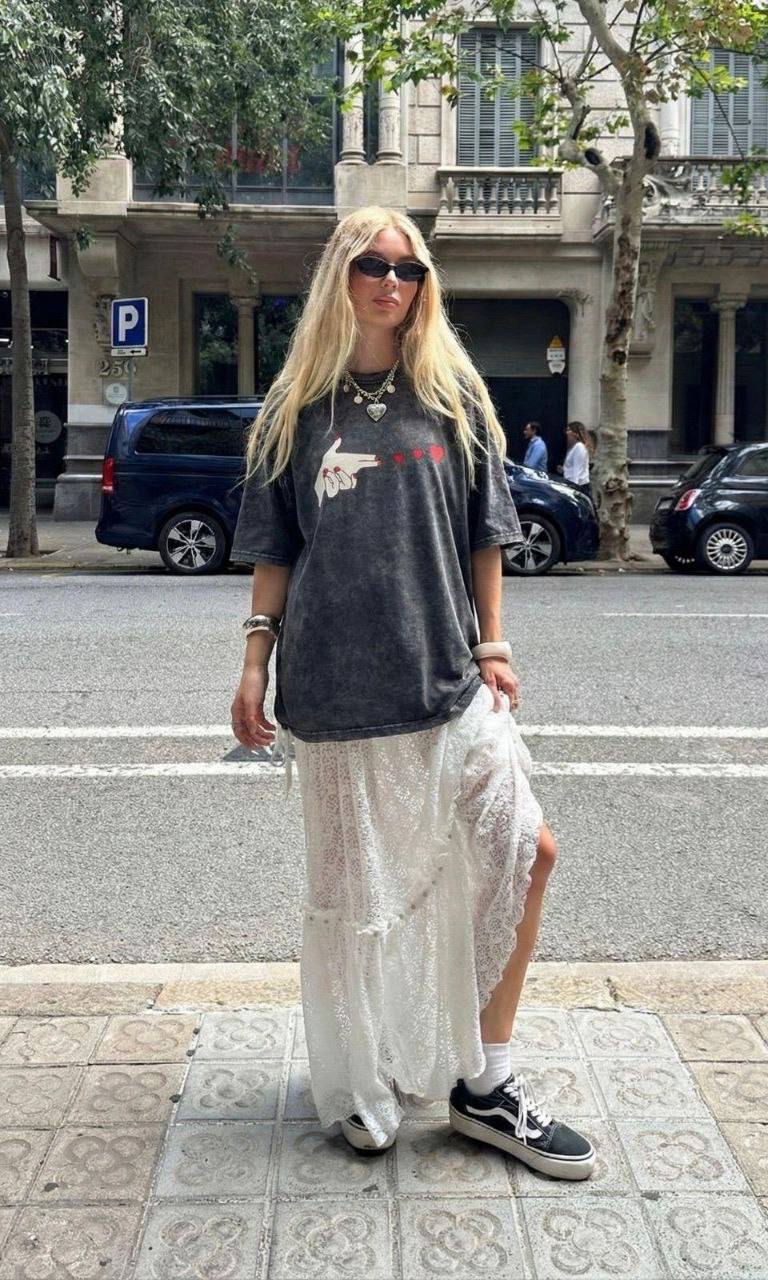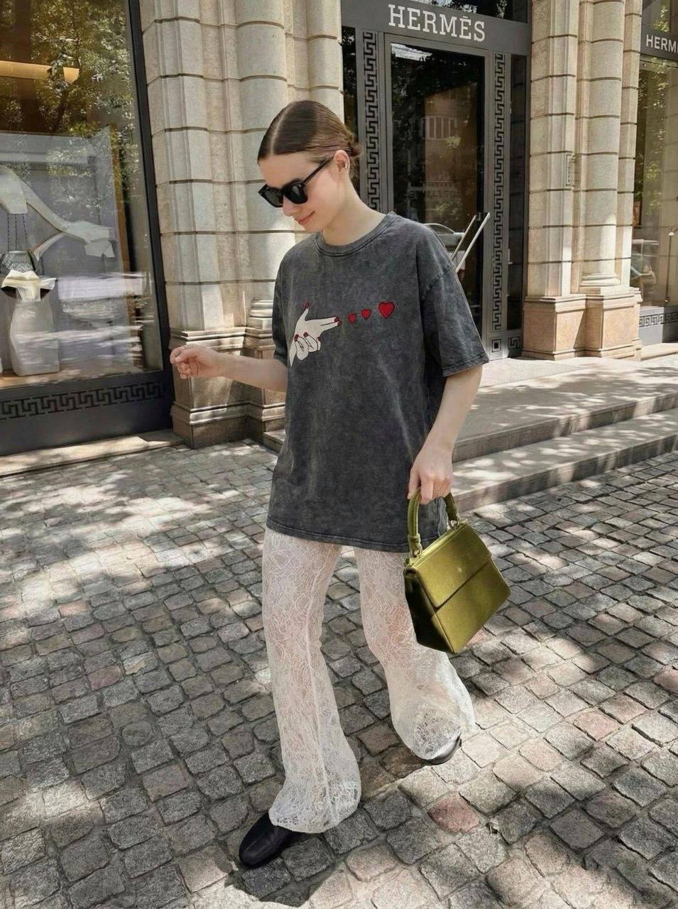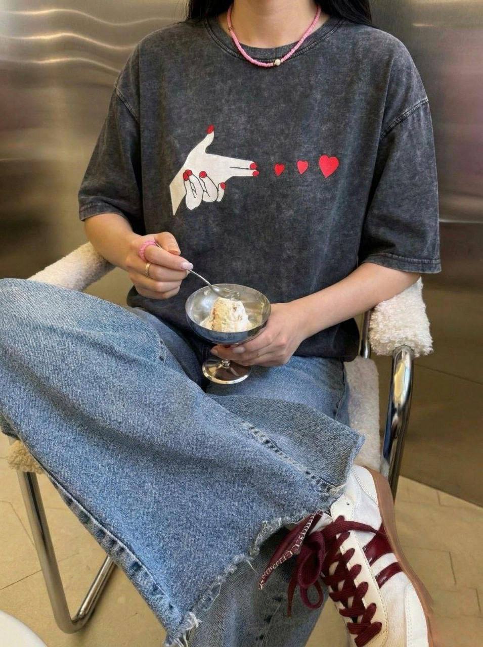 Женская Объемная Графитовая Вареная Футболка Оверсайз с Принтом Сердечки