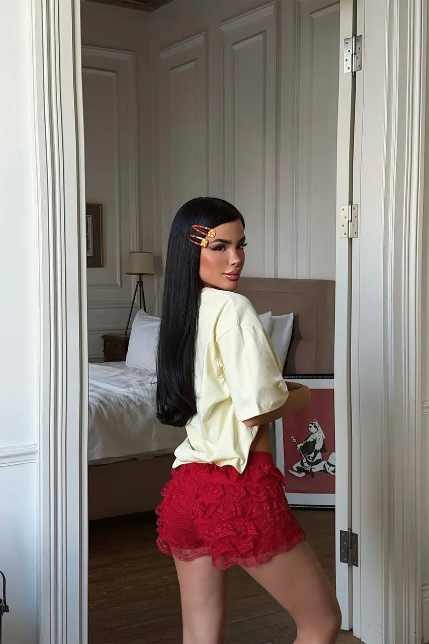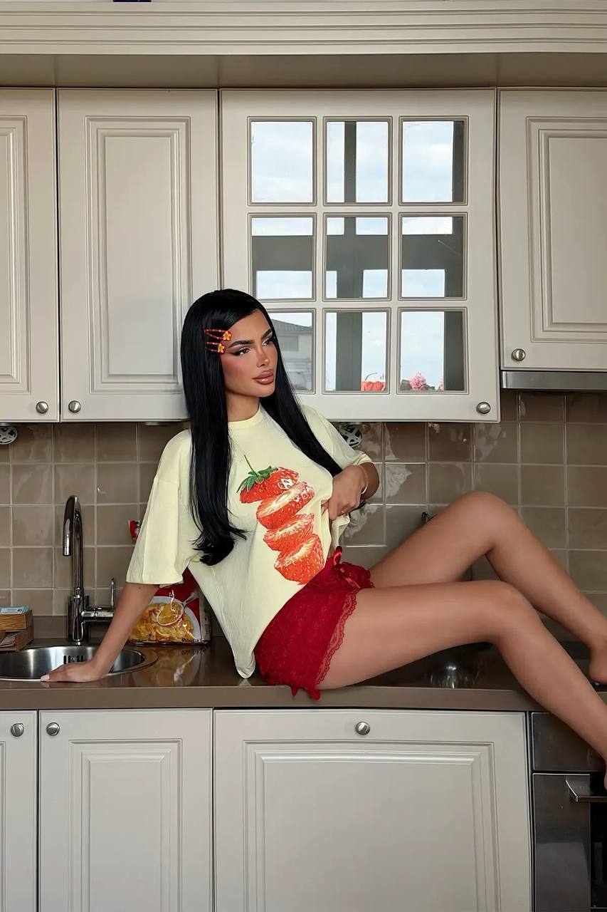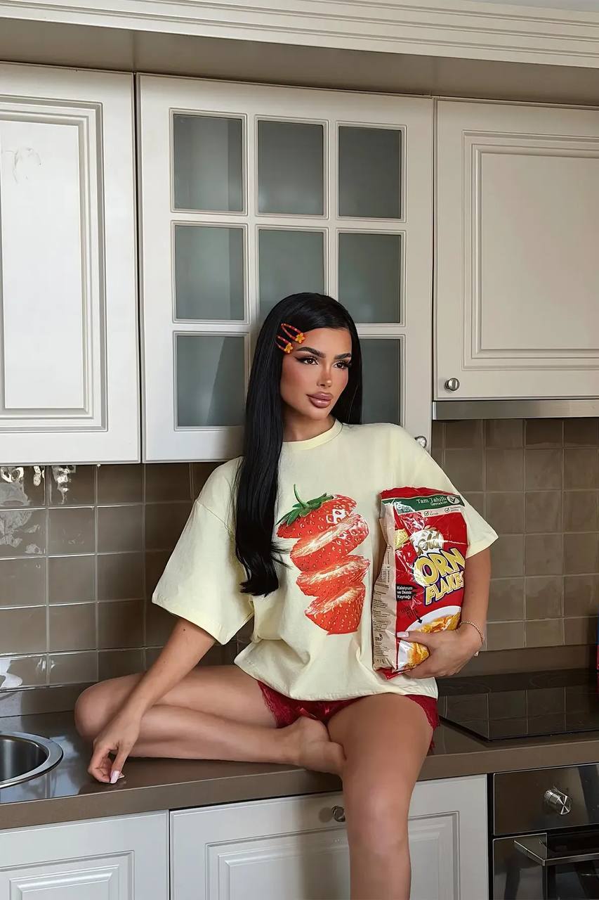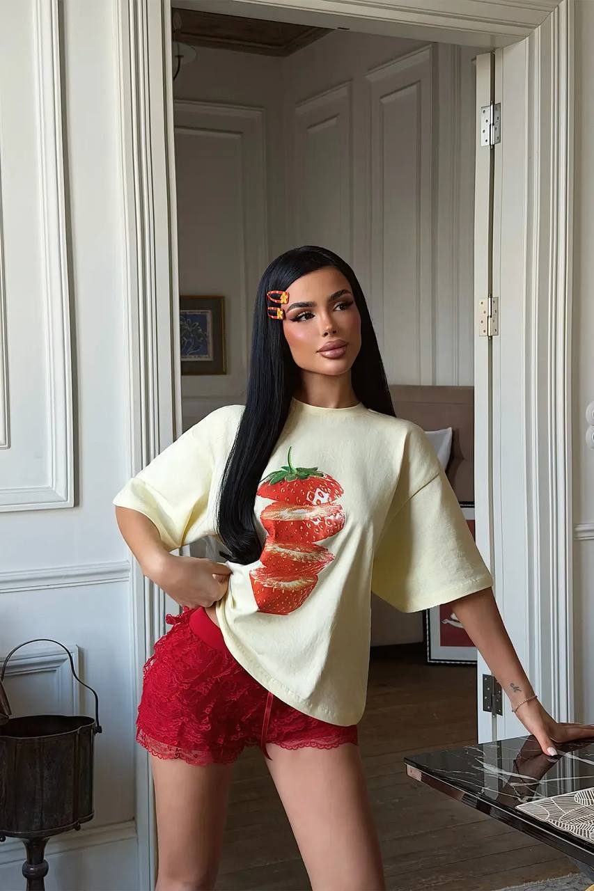 Женская Объемная Желтая Футболка Оверсайз с Принтом Клубника