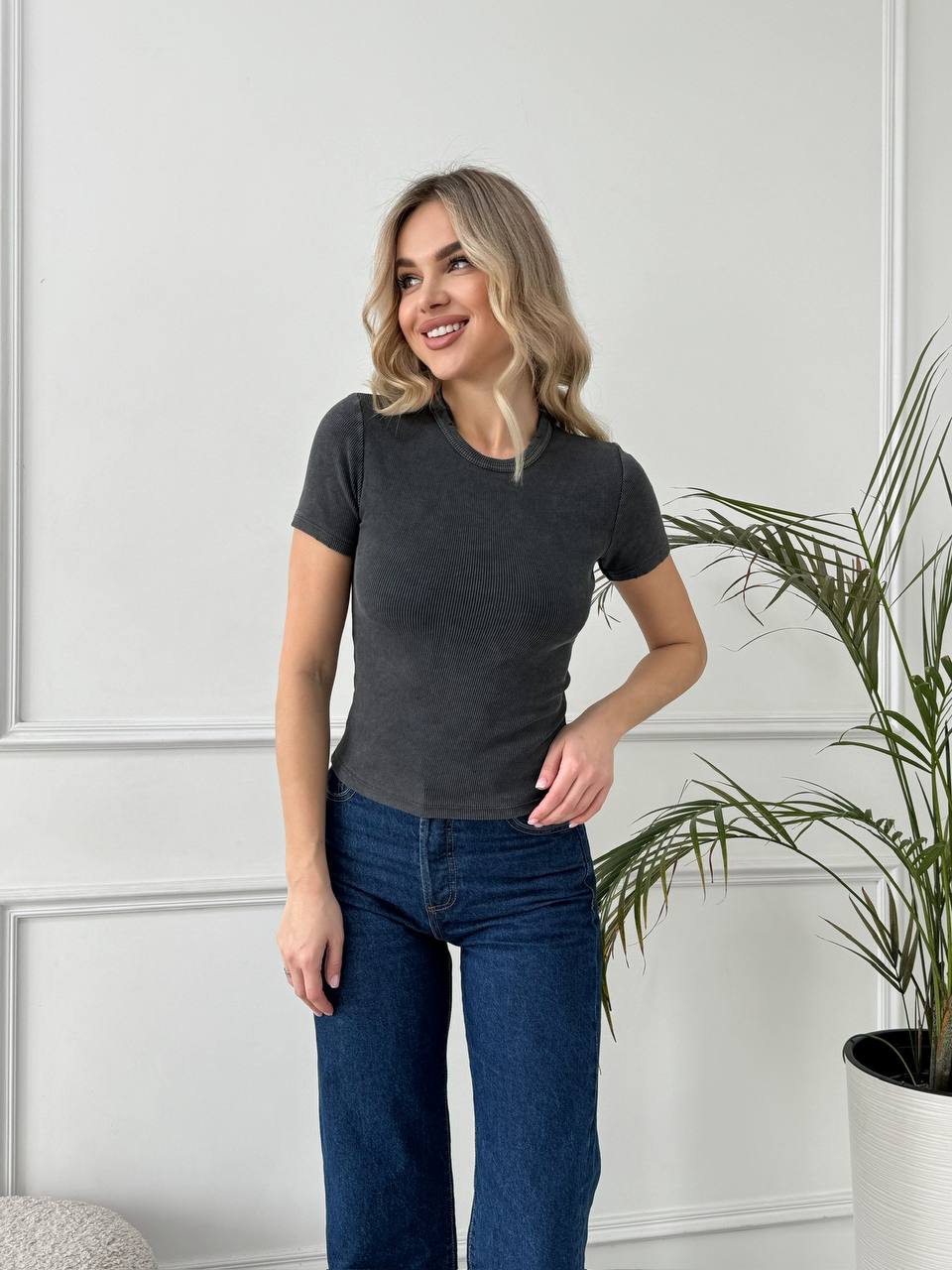 Женская Приталенная Графитовая Футболка Варенка в Рубчик