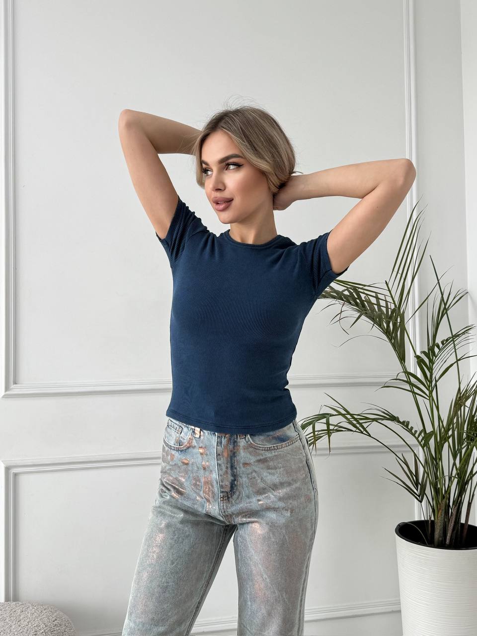 Женская Приталенная Темно-Синяя Футболка Варенка в Рубчик