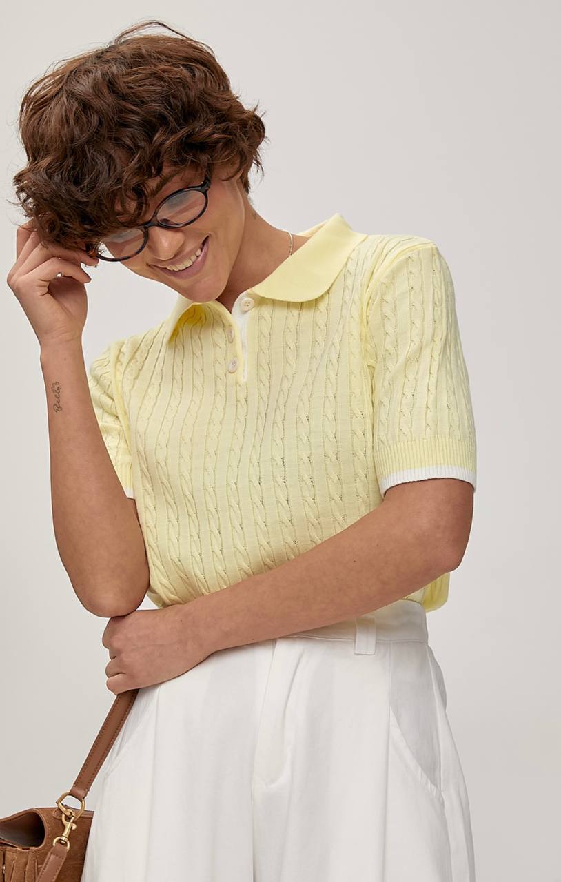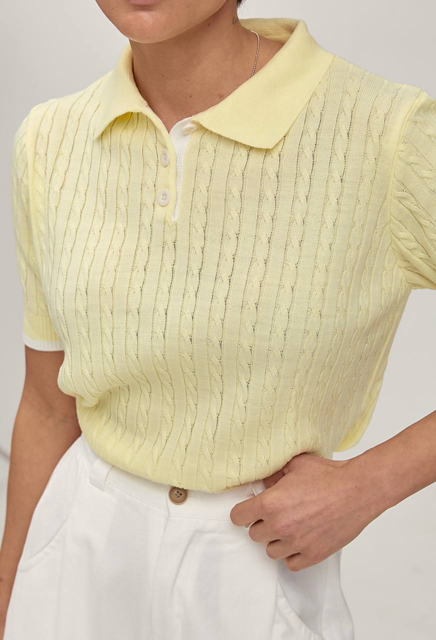 Женская Желтая Футболка Поло с Текстурным Узором Косичка и Воротником на Пуговицах