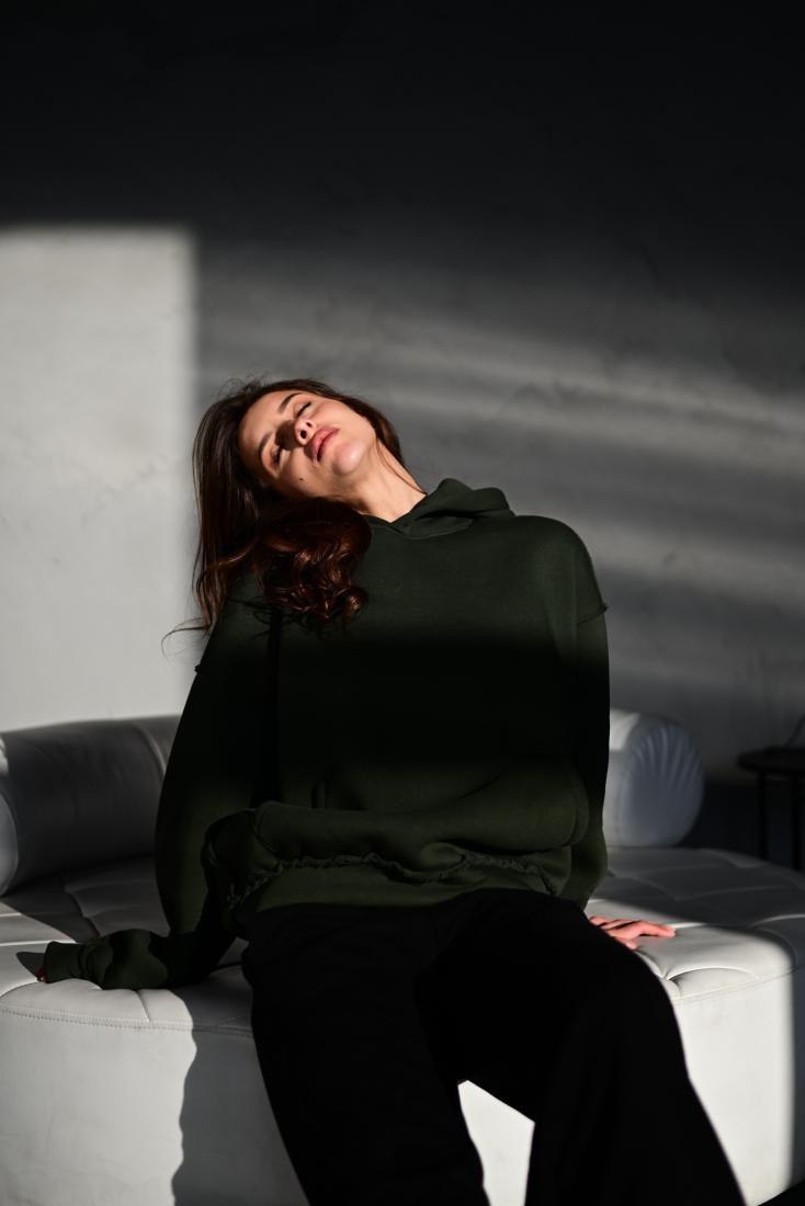 Женское Базовое Худи Хаки Оверсайз с Утеплением на Флисе