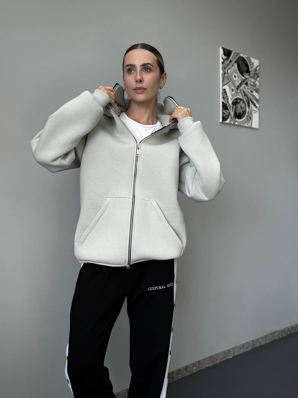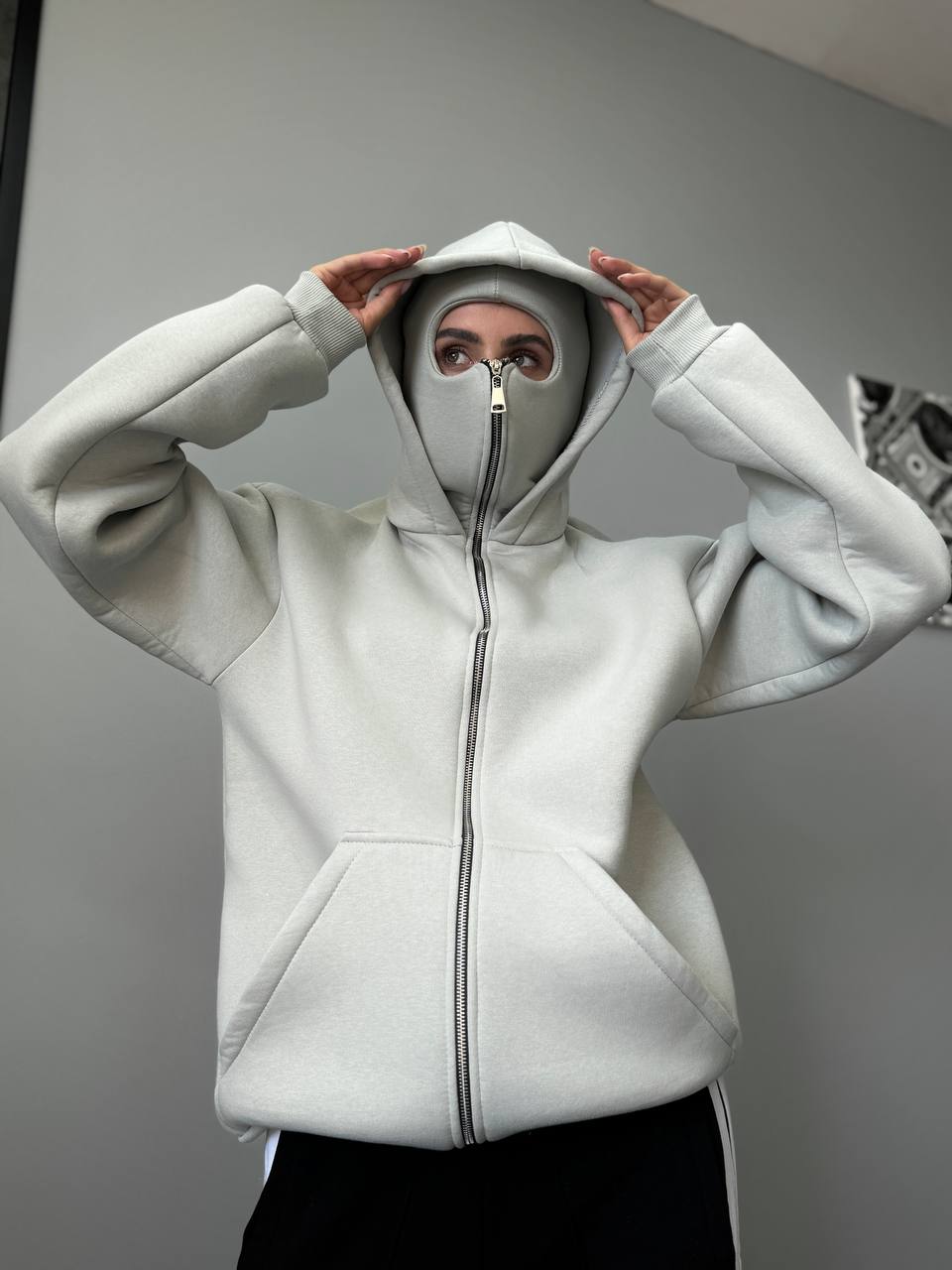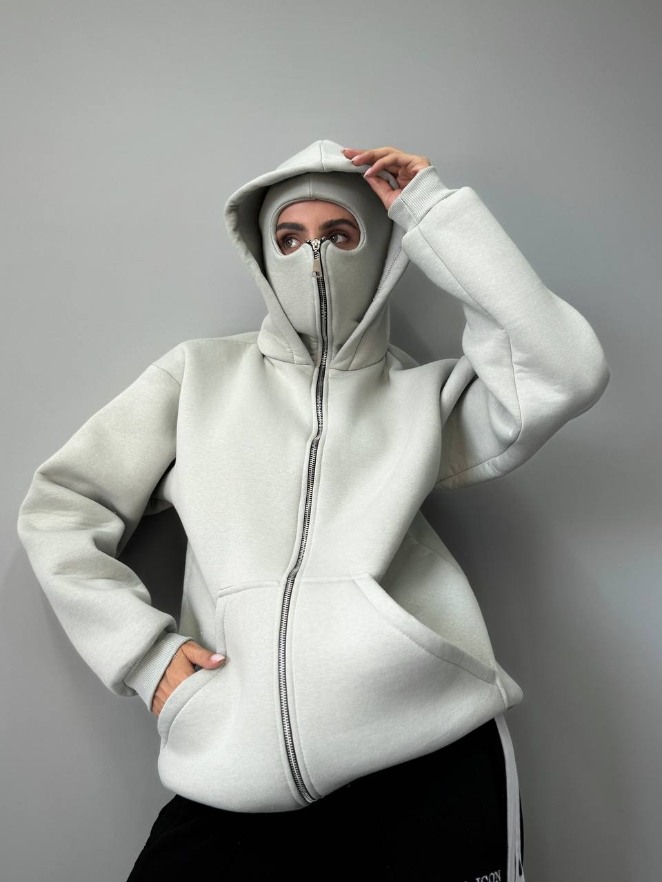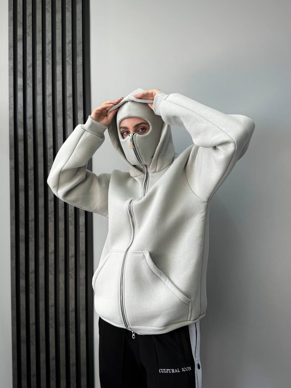 Женское Серое Зип Худи Оверсайз на Молни с Капюшоном и Балаклавой – Утепленное на Флисе