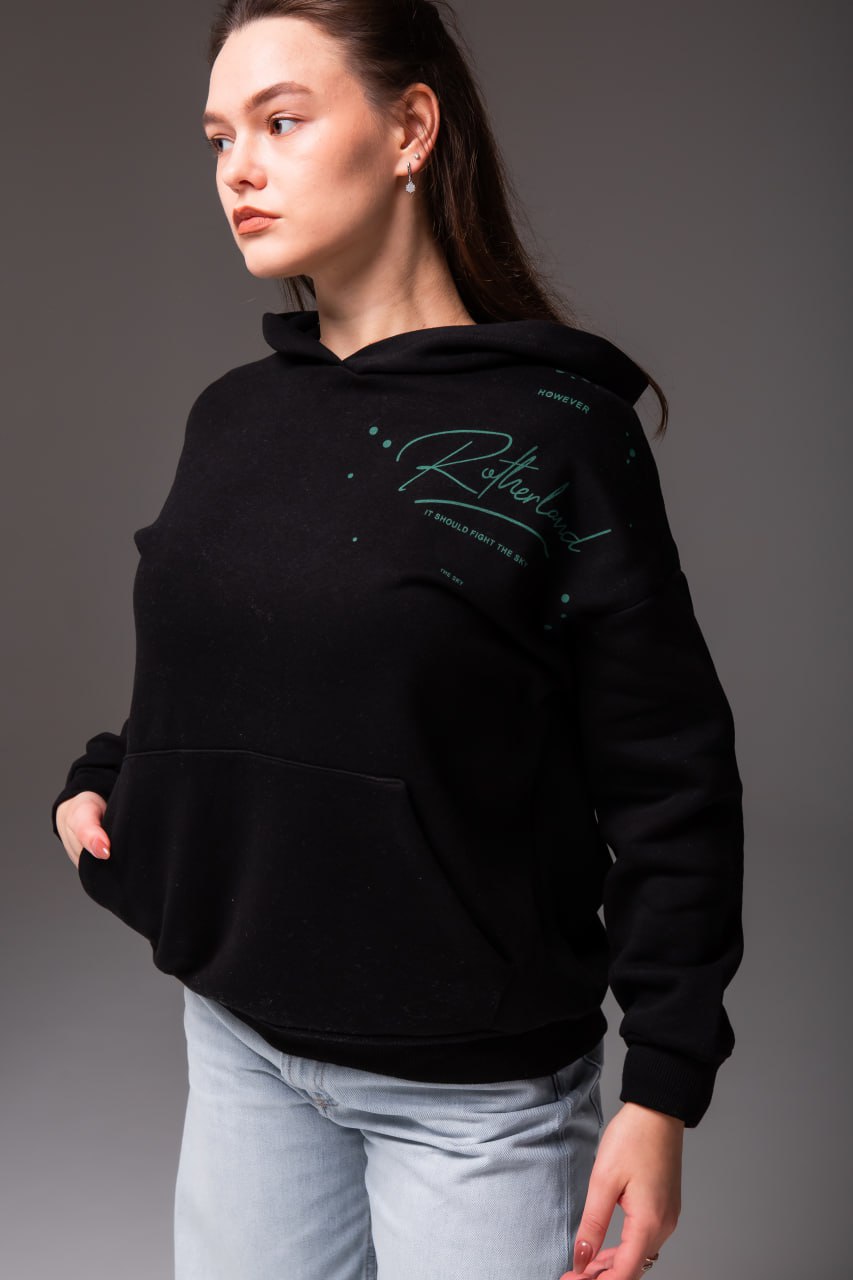 Женское Утепленное Базовое Черное Худи Оверсайз на Флисе