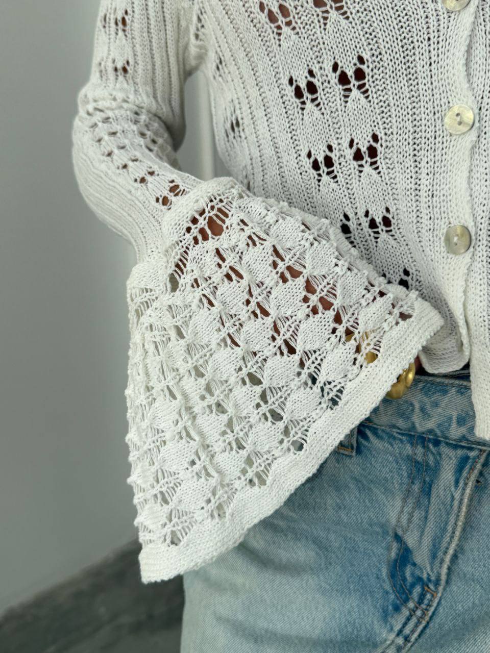 Женский Ажурный Белый Кардиган на Пуговицах с Рукавами Клеш