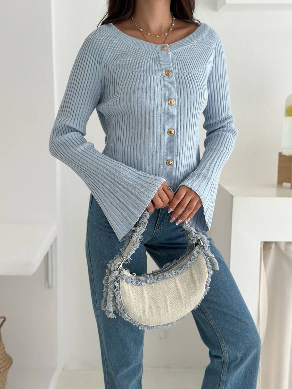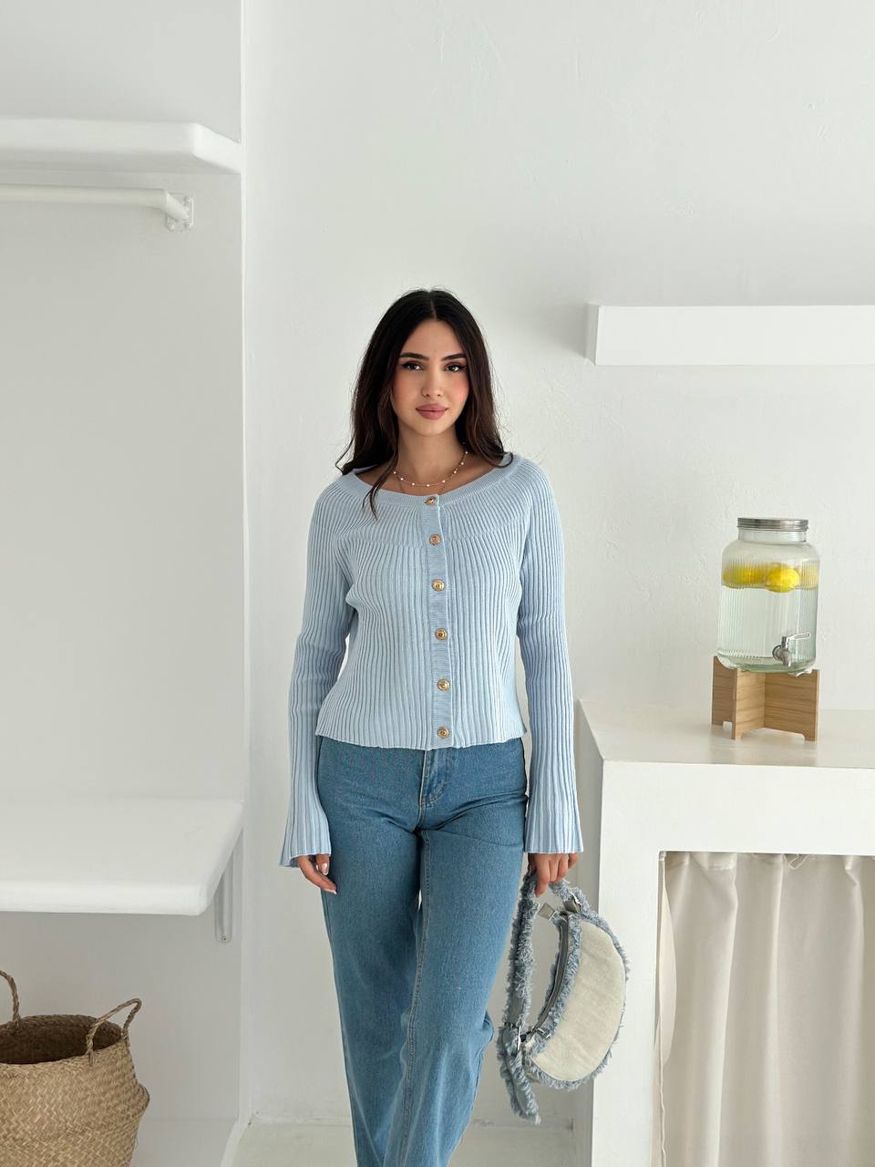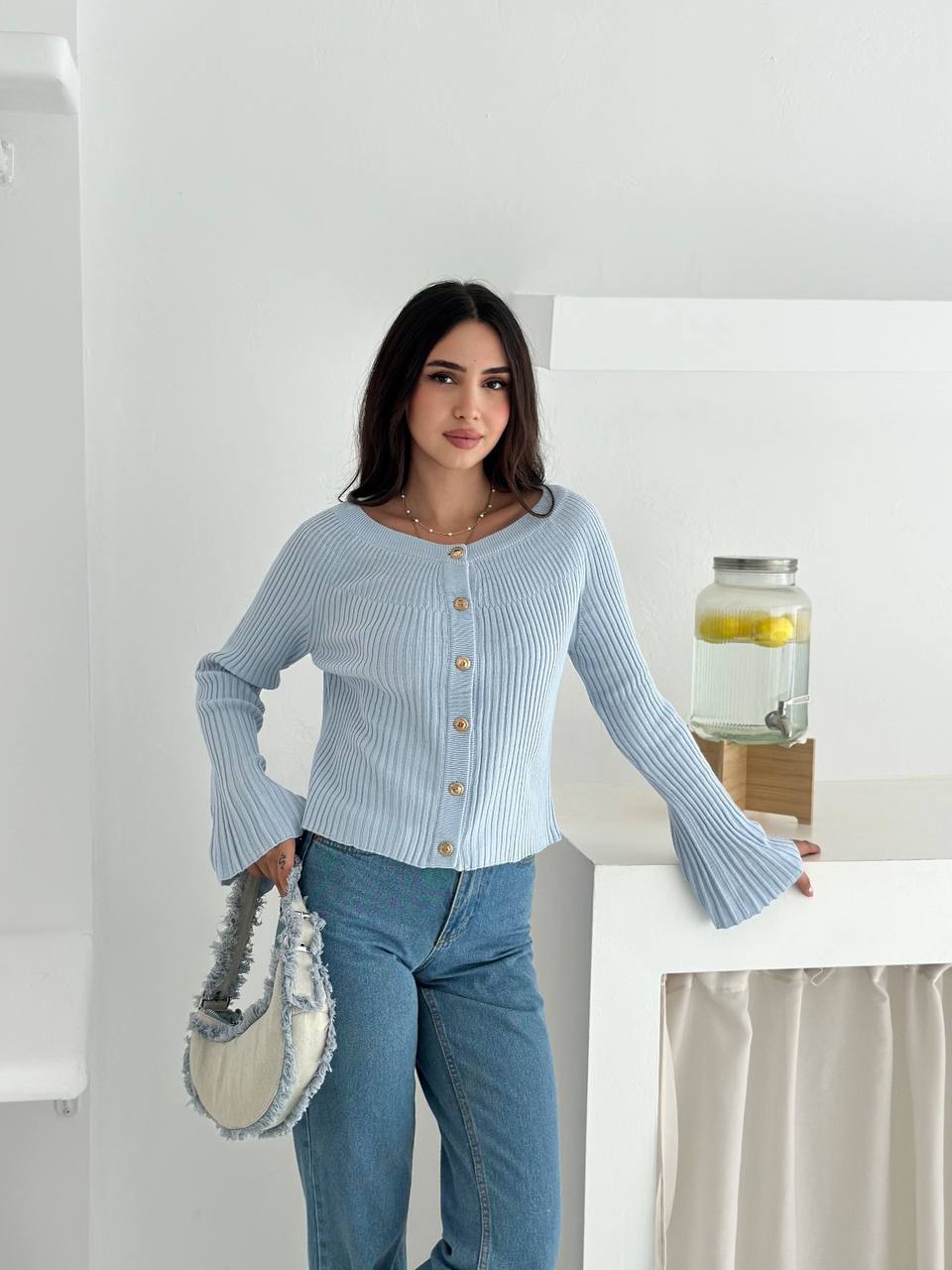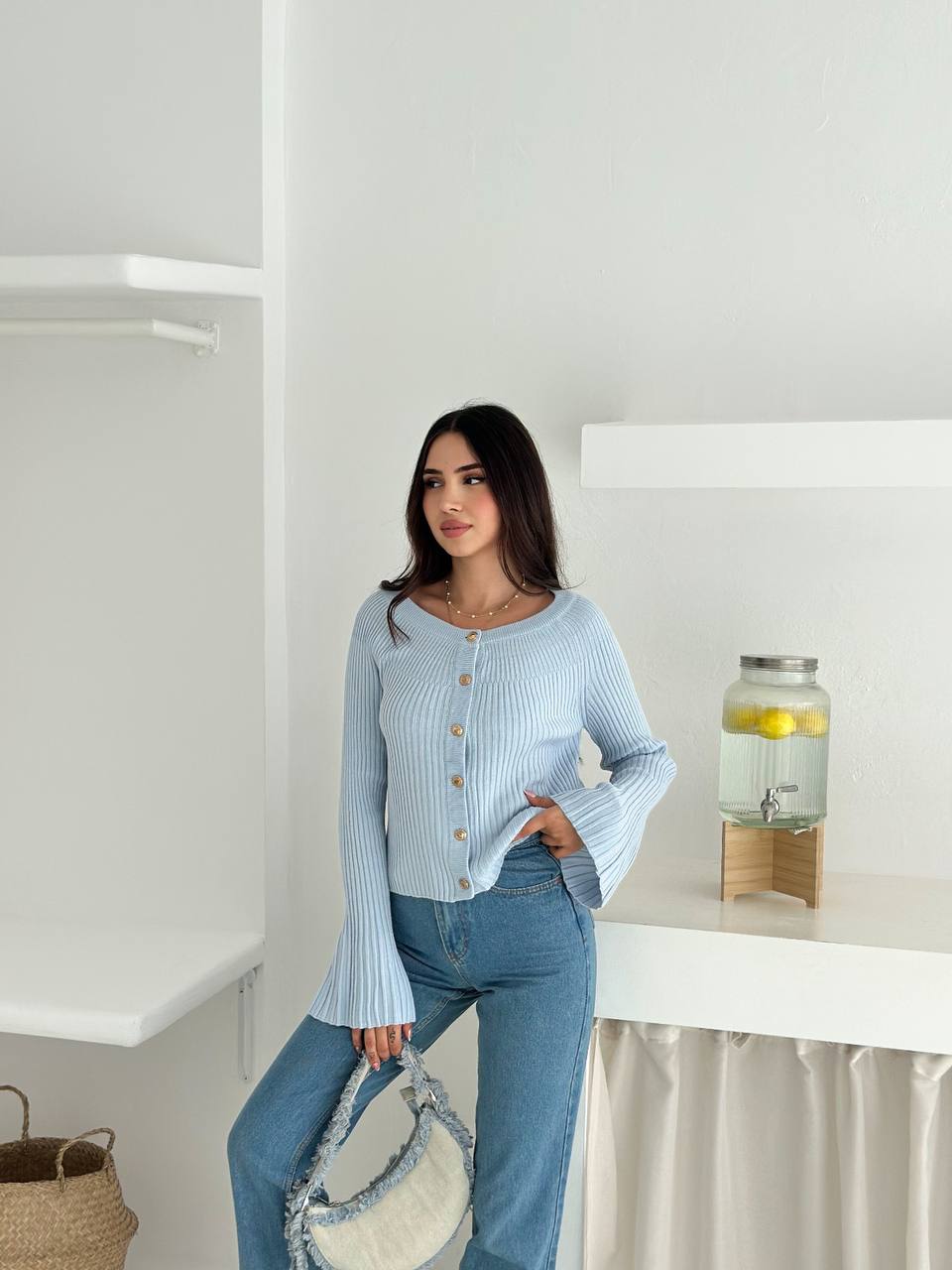 Женский Базовый Голубой Кардиган в Рубчик – Кофта на Золотистых Пуговицах с Рукавами Клеш