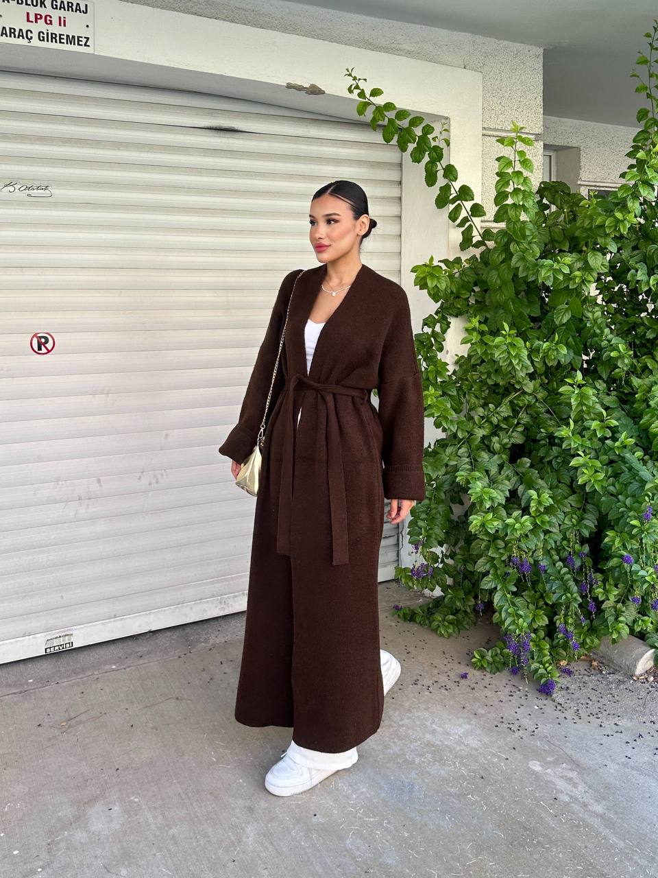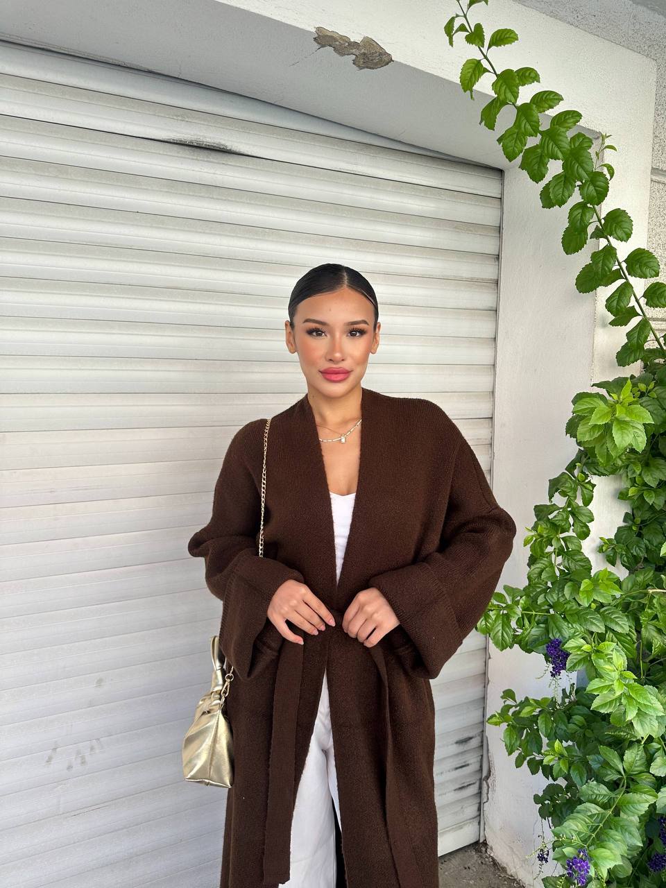 Женский Длинный Коричневый Кардиган Макси Свободного Кроя с Поясом