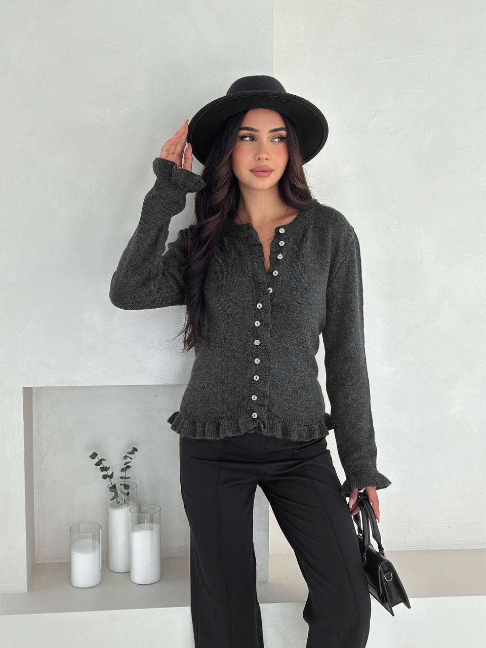 Женский Графитовый Кардиган на Пуговицах с Рюшами