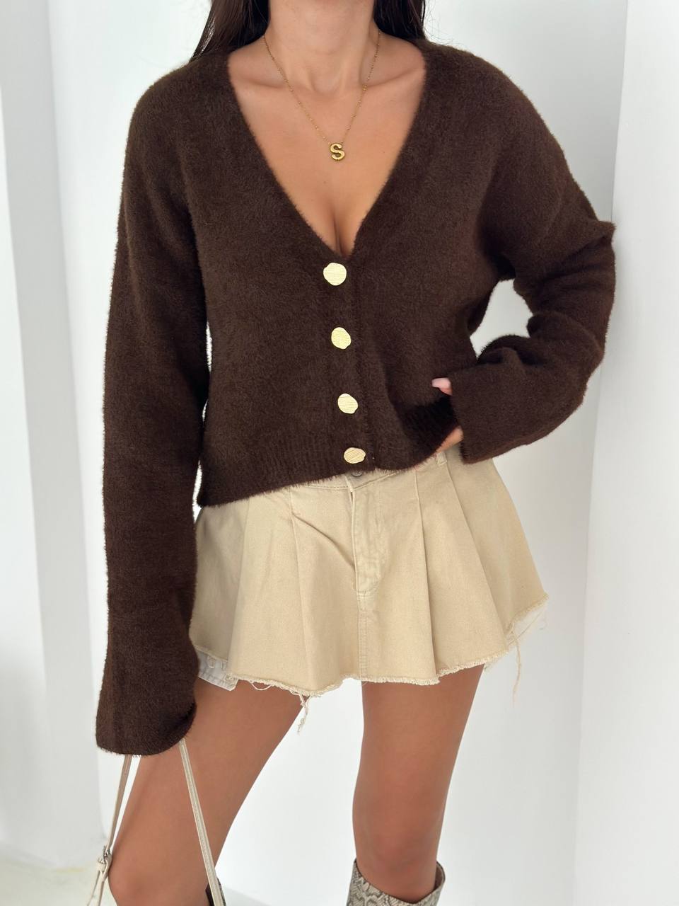 Женский Пушистый Коричневый Кардиган Свободного Кроя с Глубоким V-образным Вырезом Декольте