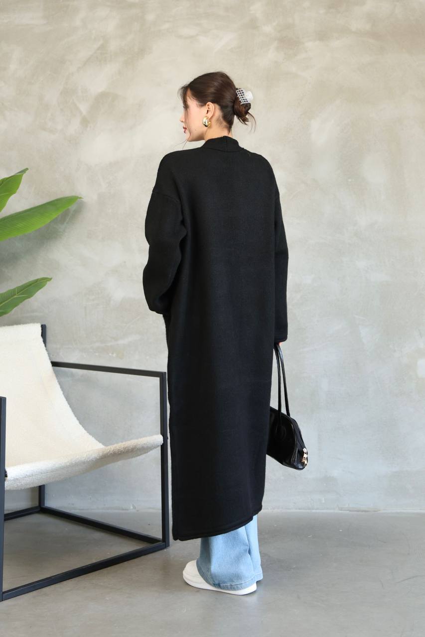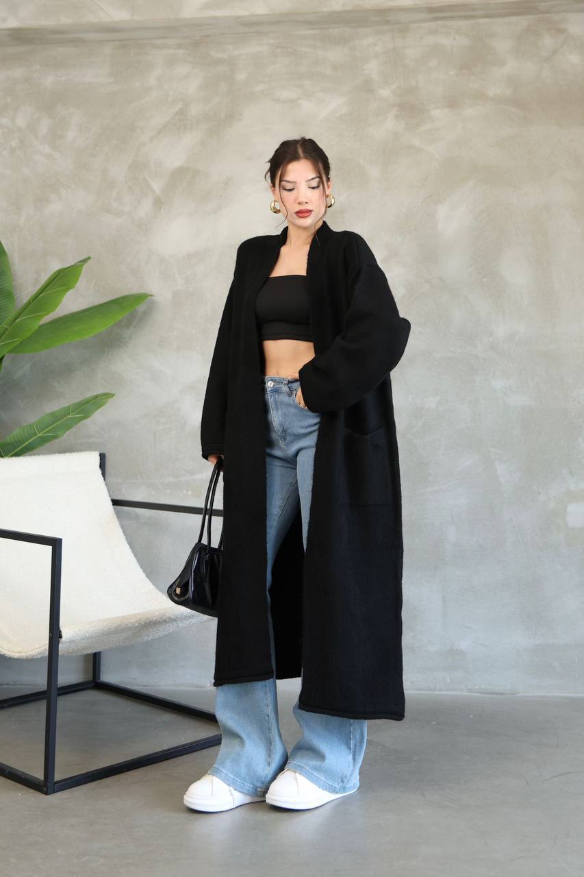 Женский Удлиненный Черный Кардиган Свободного Прямого Кроя с Карманами