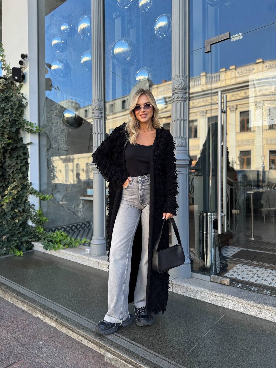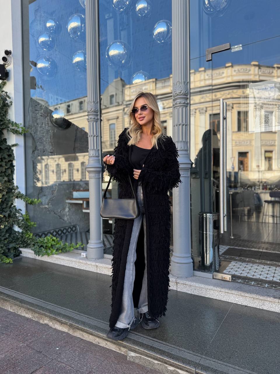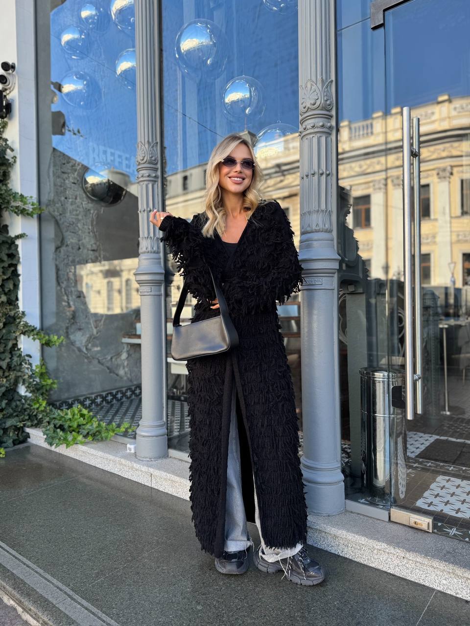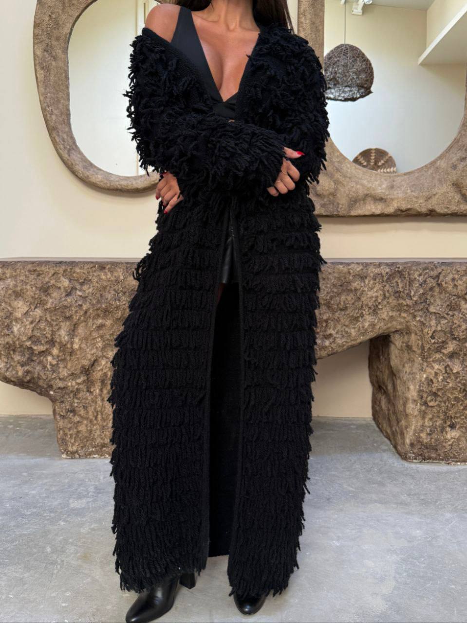 Женский Удлиненный Фактурный Черный Кардиган с Бахромой