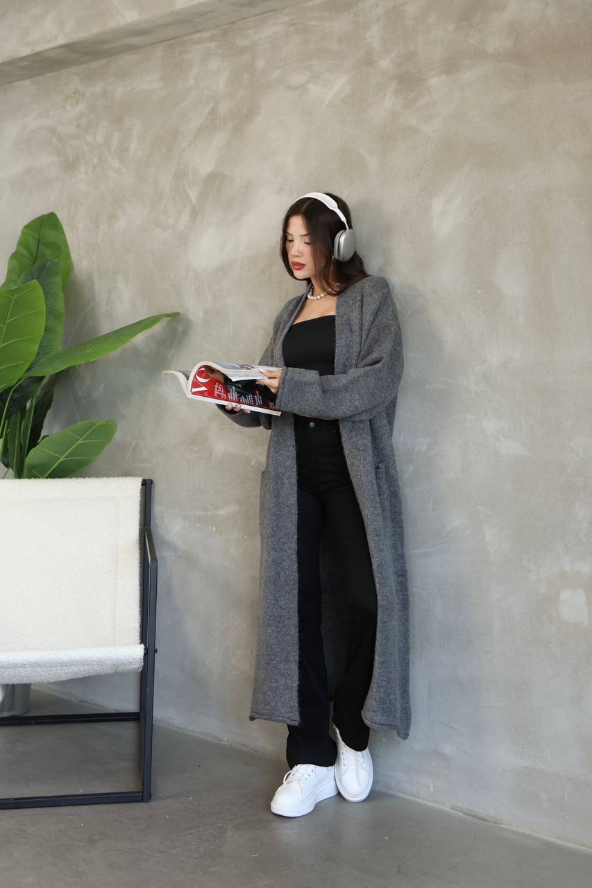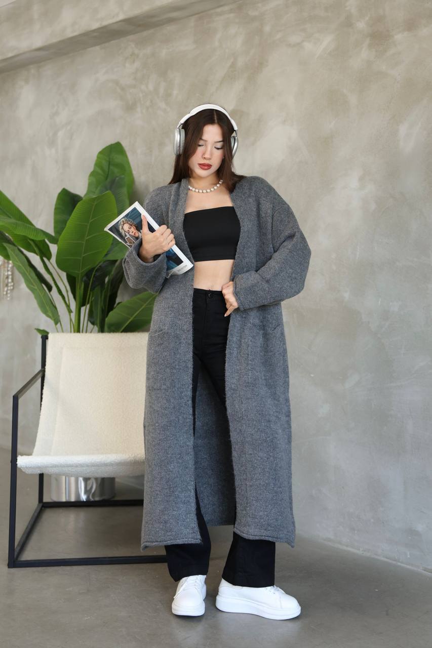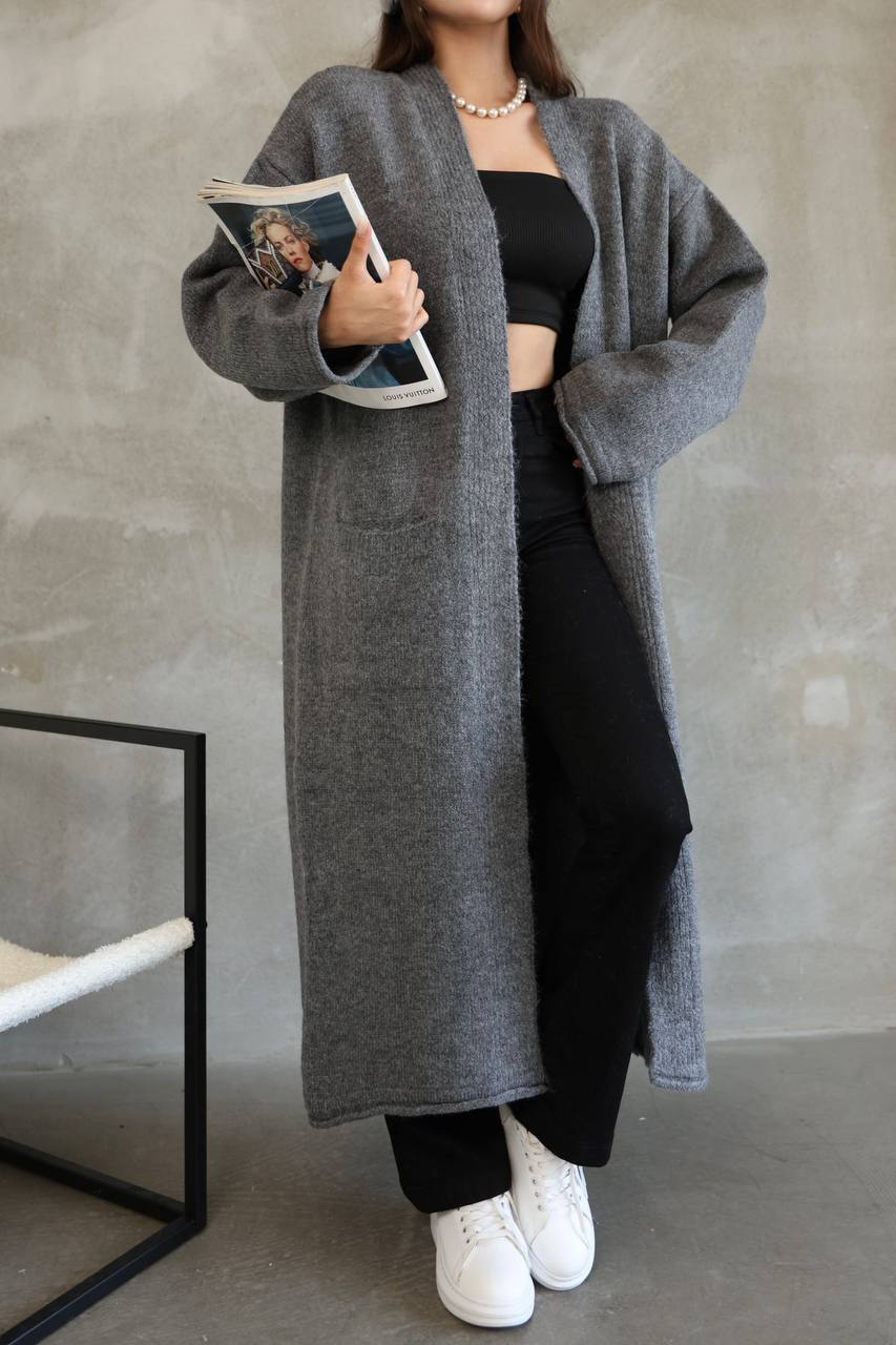 Женский Удлиненный Графитовый Кардиган Свободного Прямого Кроя с Карманами
