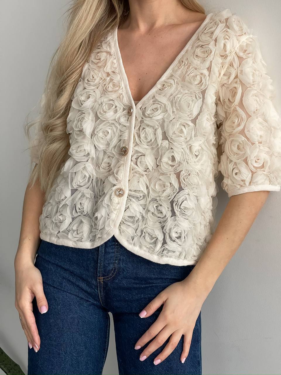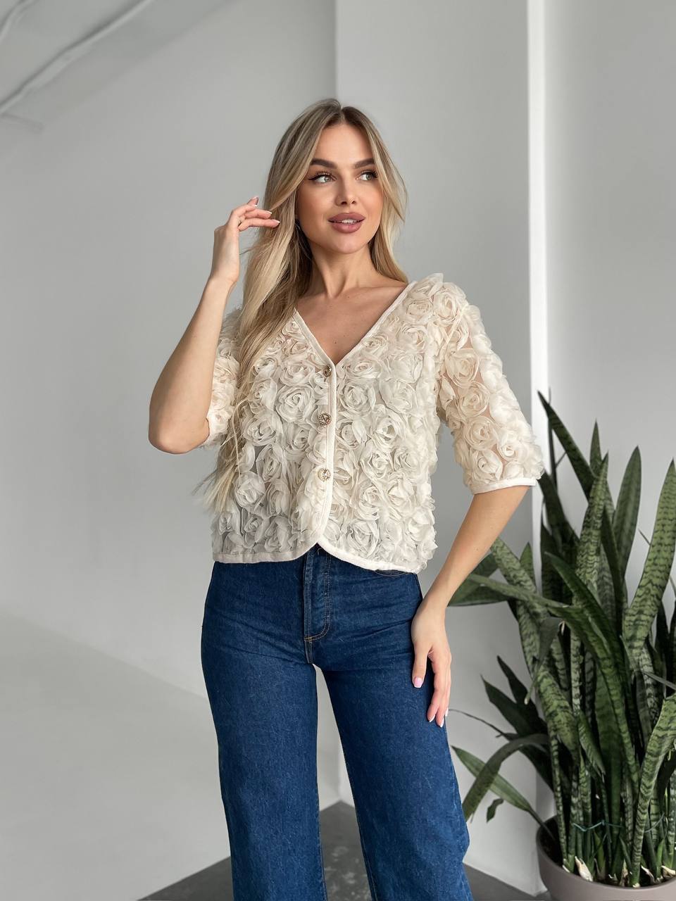 Женская Ажурная Молочная Кофта на Пуговицах с Короткими Рукавами и 3D-цветами