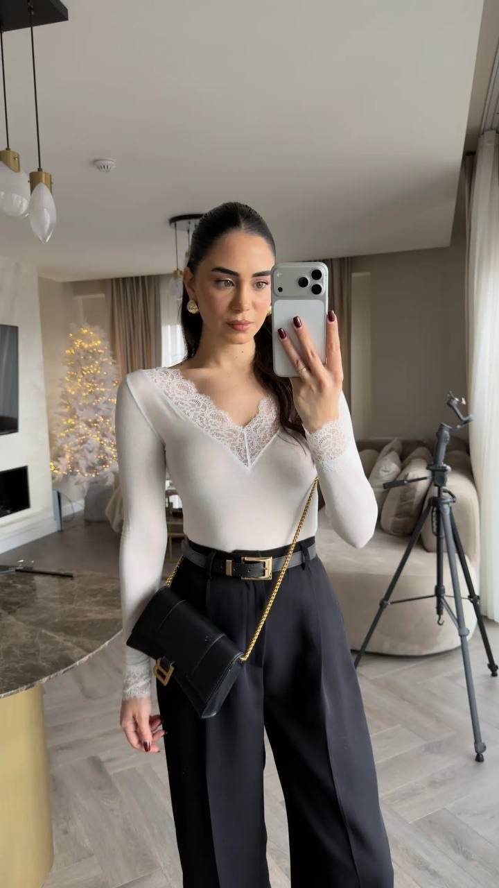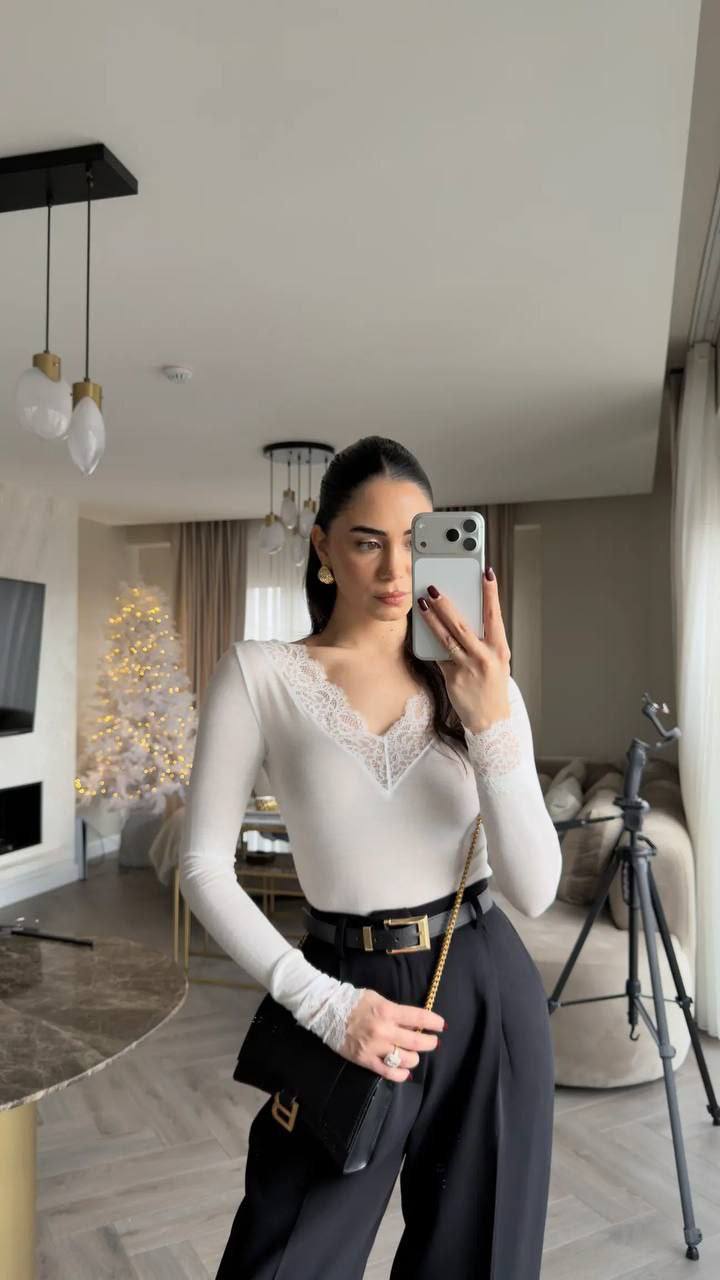 Женская Базовая Белая Кофта Лонгслив с Кружевом