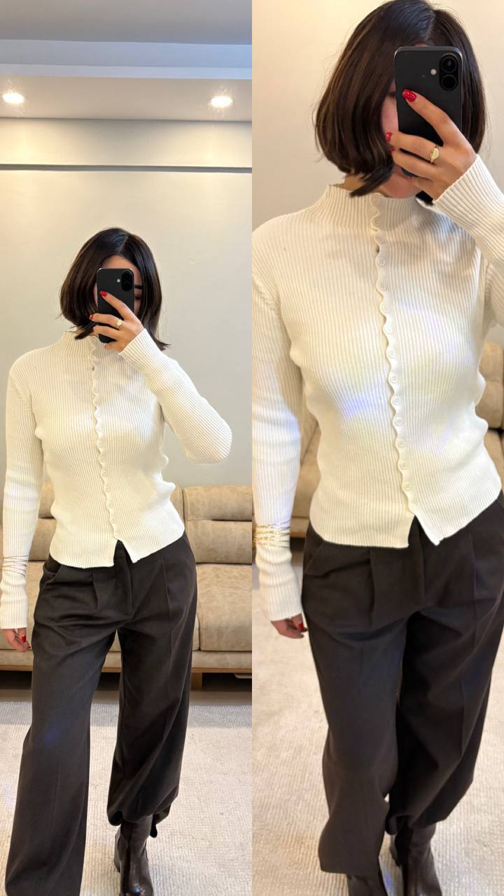 Женская Базовая Приталенная Белая Кофта в Рубчик на Пуговицах