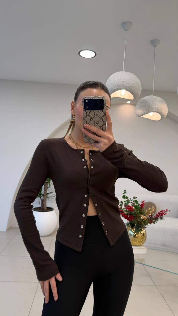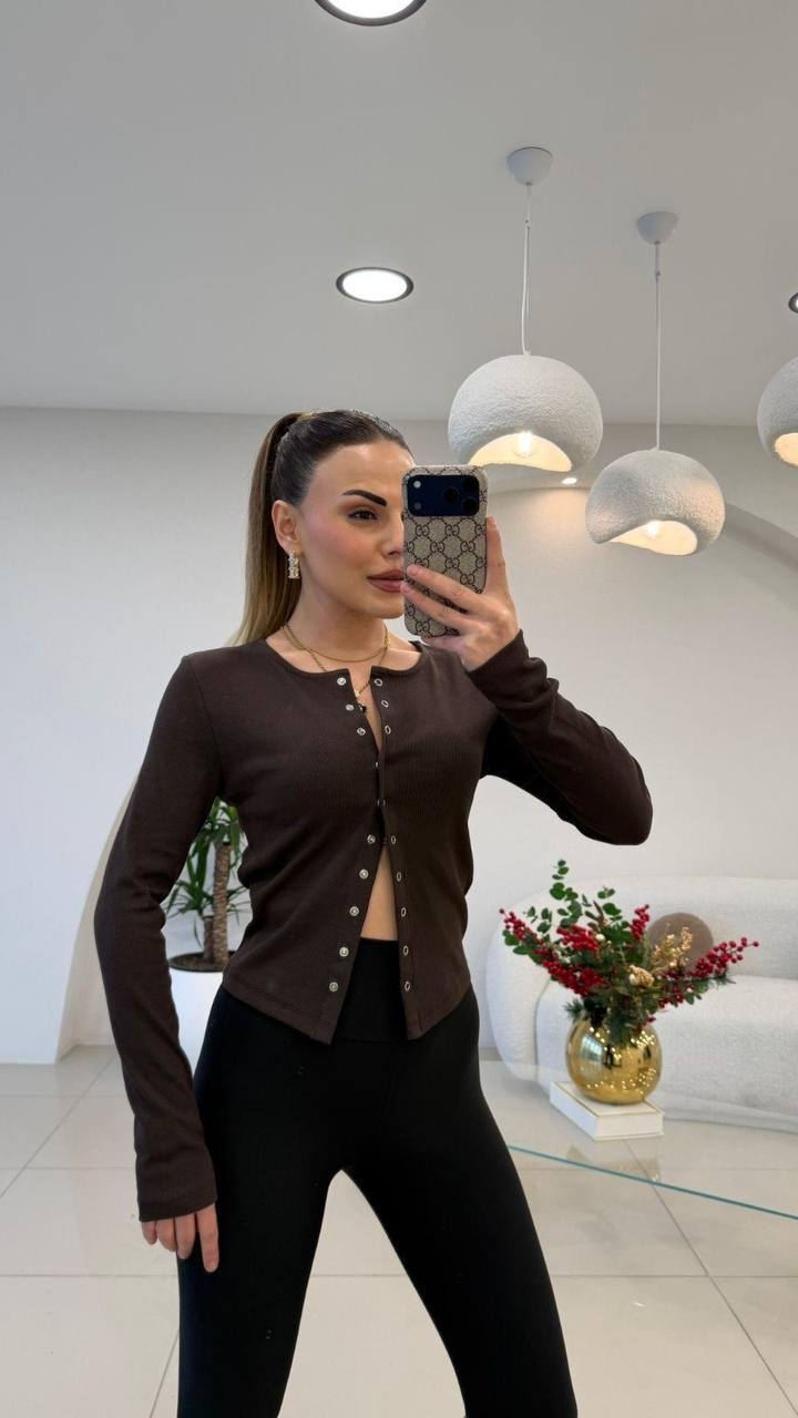 Женская Базовая Приталенная Коричневая Кофта на Кнопках