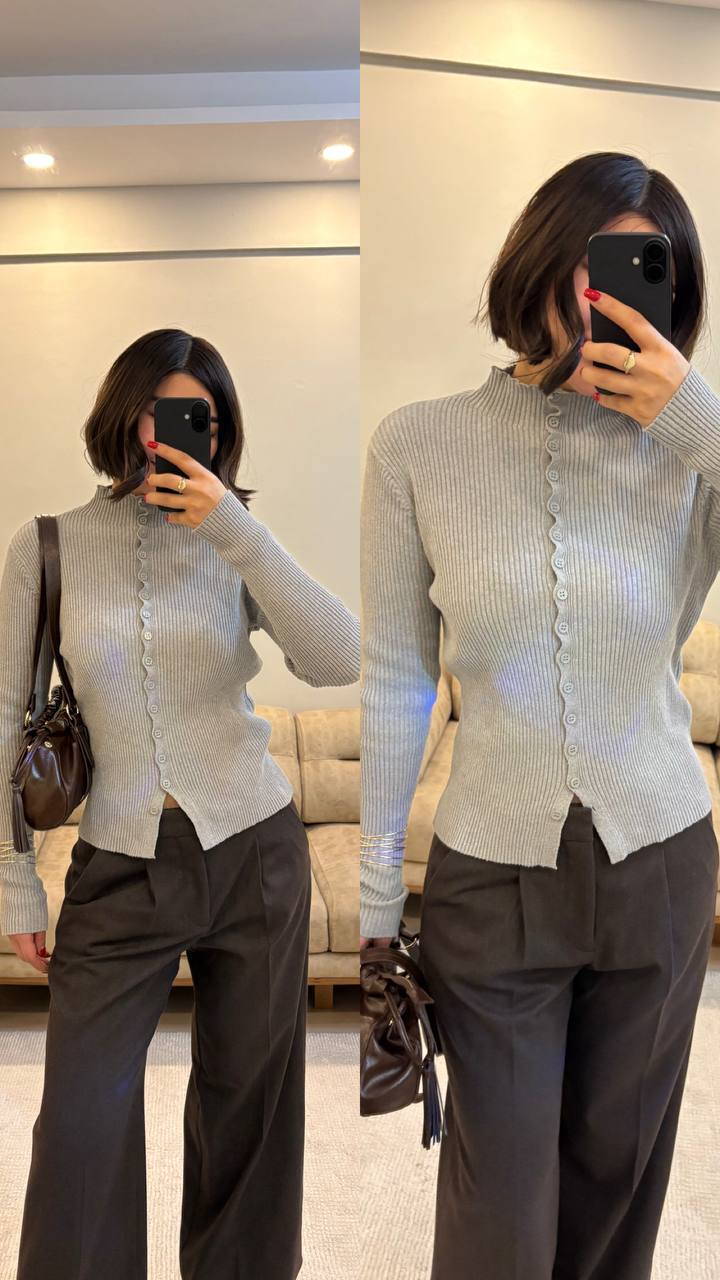 Женская Базовая Приталенная Серая Кофта в Рубчик на Пуговицах
