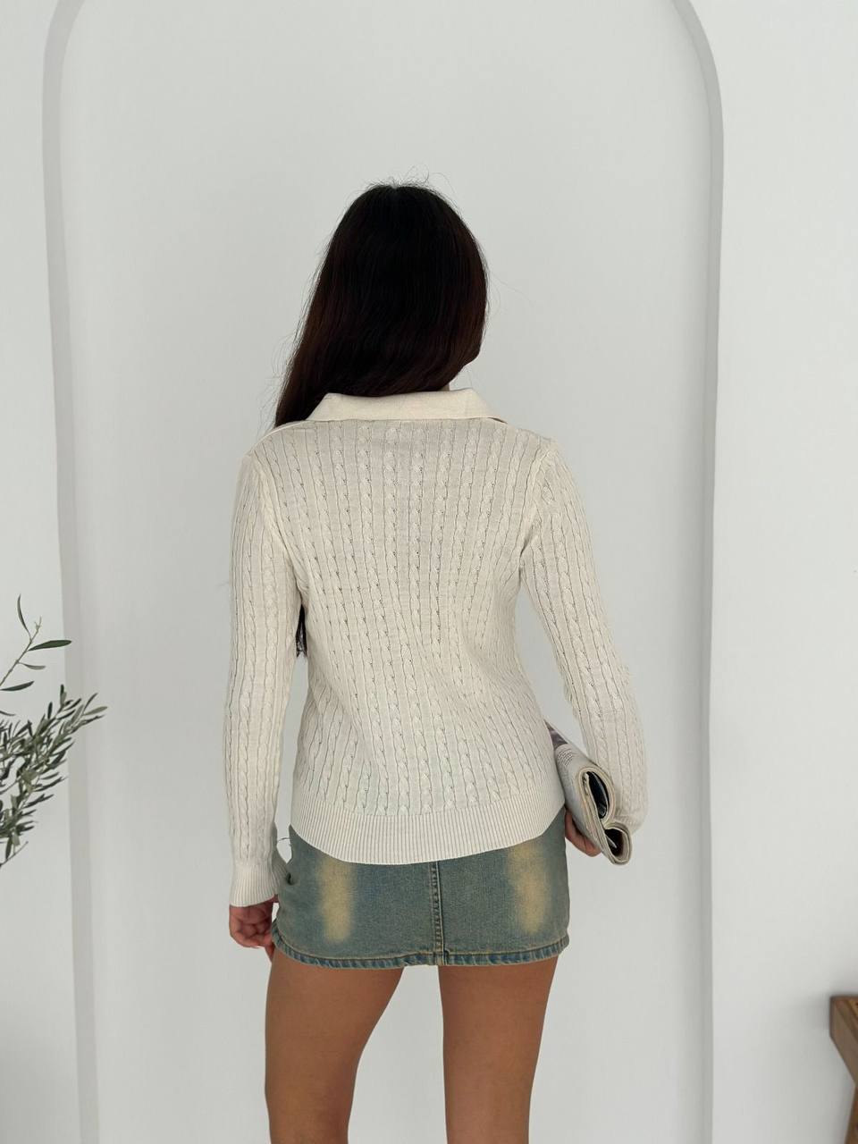 Женская Базовая Трикотажная Белая Кофта Поло с Воротником на Пуговицах